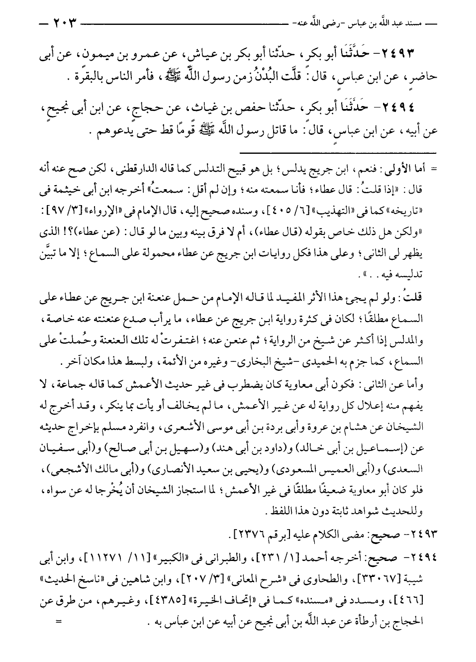 قلتُ: ولو لم يجئ هذا الأثر المفيد لما قاله الإمام من حمل عنعنة ابن جريج عن عطاء على السماع مطلقًا؛ لكان في كثرة رواية ابن جريج عن عطاء، ما يرأب صدع عنعنته عنه خاصة، والمدلس إذا أكثر عن شيخ من الرواية؛ ثم عنعن عنه؛ اغتفرتْ له تلك العنعنة وحُملتْ على السماع، كما جزم به الحميدى - شيخ البخارى - وغيره من الأئمة، ولبسط هذا مكان آخر.
