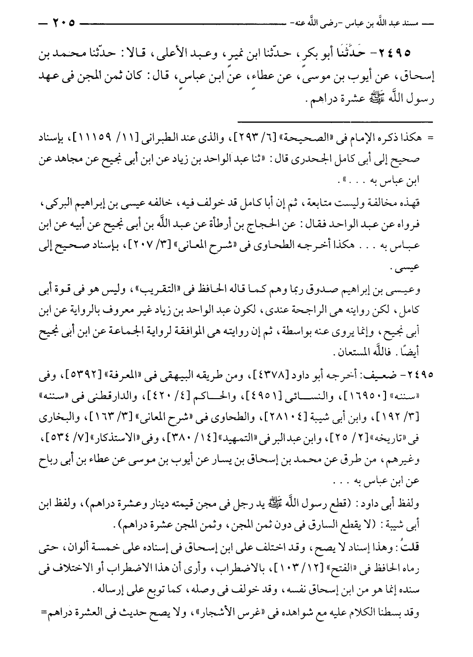 ٢٤٩٥ - حَدَّثَنَا أبو بكرٍ، حَدَّثَنَا ابن نميرٍ، وعبد الأعلى، قالا: حَدَّثَنَا محمد بن إسحاق، عن أيوب، بن موسى، عن عطاءٍ، عن ابن عباسٍ، قال: كان ثمن المجن في عهد رسول الله - صلى الله عليه وسلم - عشرة دراهم.