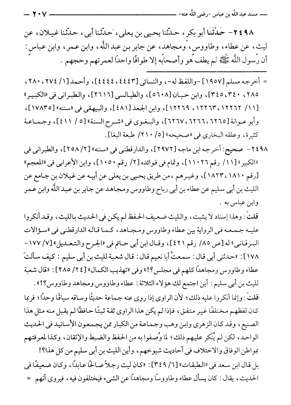 ٢٤٩٨ - صحيح: أخرجه ابن ماجه [٢٩٧٢]، والدارقطنى في "سننه" [٢/ ٢٥٨]، والطبرانى في "الكبير" [١١/ رقم ١١٠٢٦]، وتمام في فوائده [٢/ رقم ١٠٥٠]، وابن الأعرابى في "المعجم" [رقم ١٨١٠، ١٨٢٣]، وغيرهم، من طريق يحيى بن يعلى عن أبيه عن غيلان بن جامع عن الليث بن أبى سليم عن عطاء بن أبى رباح وطاووس ومجاهد عن جابر بن عبد الله وابن عمر وابن عباس به. قلتُ: وهذا إسناد لا يثبت، والليث ضعيف الحفظ لم يكن في الحديث بالليث، وقد أنكروا عليه جمعه في الرواية بين عطاء وطاووس ومجاهد، كما قاله الدارقطنى في "سؤالات البرقانى" له [ص ٨٥/ رقم ٤٢١]، وقال ابن أبى حاتم في "الجرح والتعديل" [٧/ ١٧٧ - ١٧٨]: "حدثنى أبى قال: سمعتُ أبا نعيم قال: قال شعبة لليث بن أبى سليم: كيف سألتَ عطاء وطاووس ومجاهدًا كلهم في مجلس؟! " وفى "تهذيب الكمال" [٢٤/ ٢٨٥]: "قال شعبة لليث بن أبى سليم: أين اجتمع لك هؤلاء الثلاثة: عطاء وطاووس ومجاهد وطاووس؟! ".