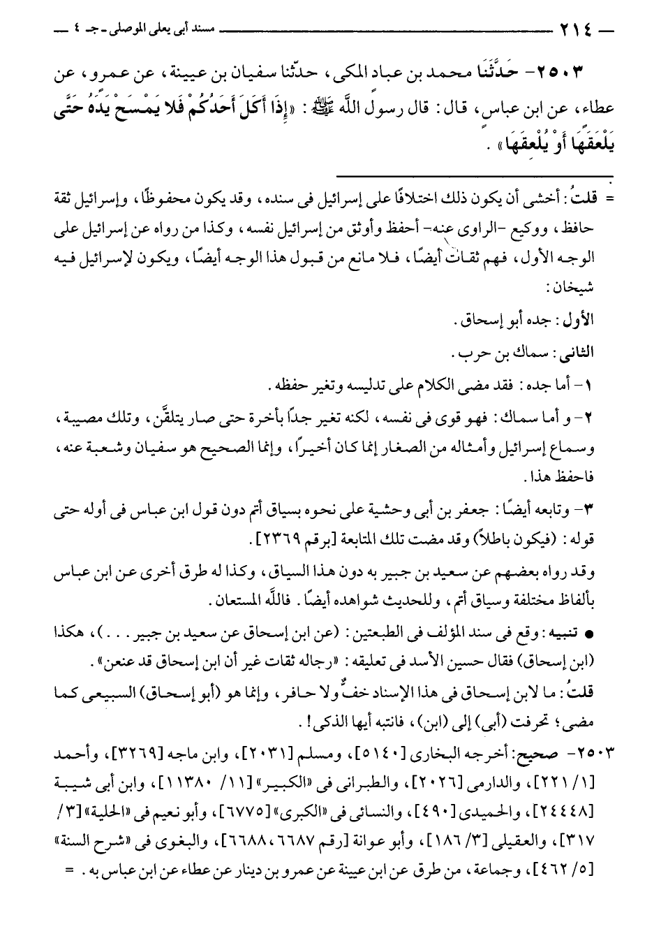 • تنبيه: وقع في سند المؤلف في الطبعتين: (عن ابن إسحاق عن سعيد بن جبير ... )، هكذا (ابن إسحاق) فقال حسين الأسد في تعليقه: "رجاله ثقات غير أن ابن إسحاق قد عنعن".