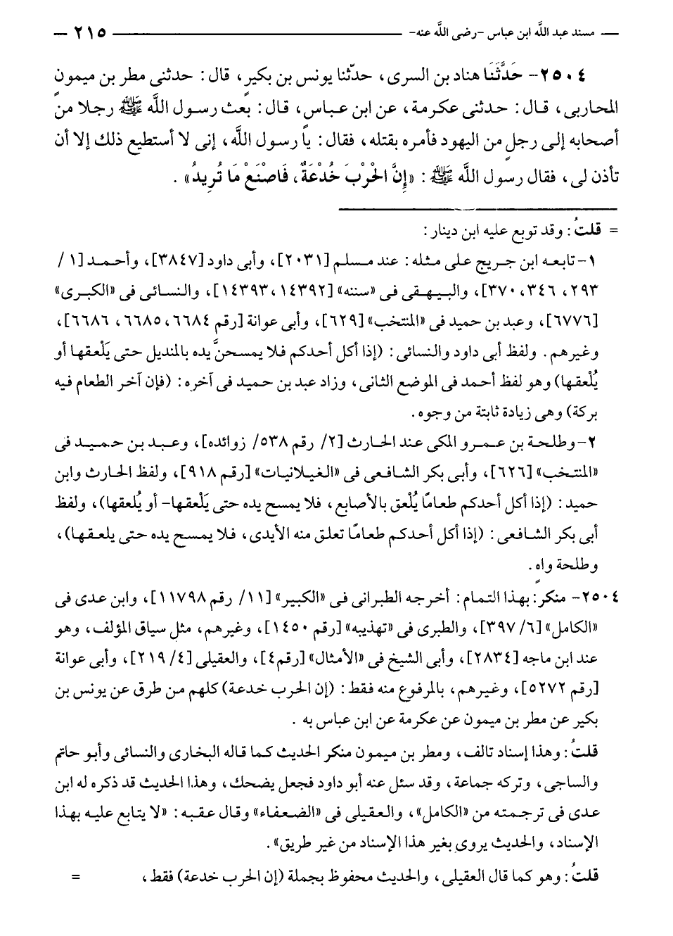 ٢٥٠٤ - حَدَّثَنَا هناد بن السرى، حدّثنا يونس بن بكيرٍ، قال: حدثنى مطر بن ميمونٍ المحاربى، قال: حدثنى عكرمة، عن ابن عباسٍ، قال: بعث رسول الله - صلى الله عليه وسلم - رجلا من أصحابه إلى رجلٍ من اليهود فأمره بقتله، فقال: يا رسول الله، إنى لا أستطيع ذلك إلا أن تأذن لى، فقال رسول الله - صلى الله عليه وسلم -: "إِن الحرْبَ خدْعَةٌ، فَاصْنَعْ مَا ترِيدُ".