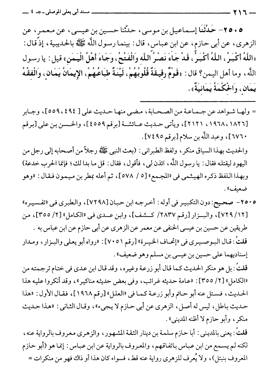 ٢٥٠٥ - حَدَّثَنَا إسماعيل بن موسى، حدّثنا حسين بن عيسى، عن معمرٍ، عن الزهرى، عن أبى حازمٍ، عن ابن عباسٍ، قال: بينما رسول الله - صلى الله عليه وسلم - بالحديبية، إذ قال: "اللهُ أَكْبَرُ، اللَّهُ أَكْبَرُ، قَدْ جَاءَ نَصْرُ اللَّهِ وَالْفَتْحُ، وَجَاءَ أَهْلُ الْيَمَنِ" قيل: يا رسول الله، وما أهل اليمن؟ قال: "قَوْمٌ رقِيقَةٌ قُلُوبُهُمْ، لَيِّنَةٌ طِبَاعُهُمْ، الإيمَانُ يَمَانٍ، وَالْفِقْهُ يَمَانٍ، وَالْحِكْمَةُ يَمَانِيَةٌ".