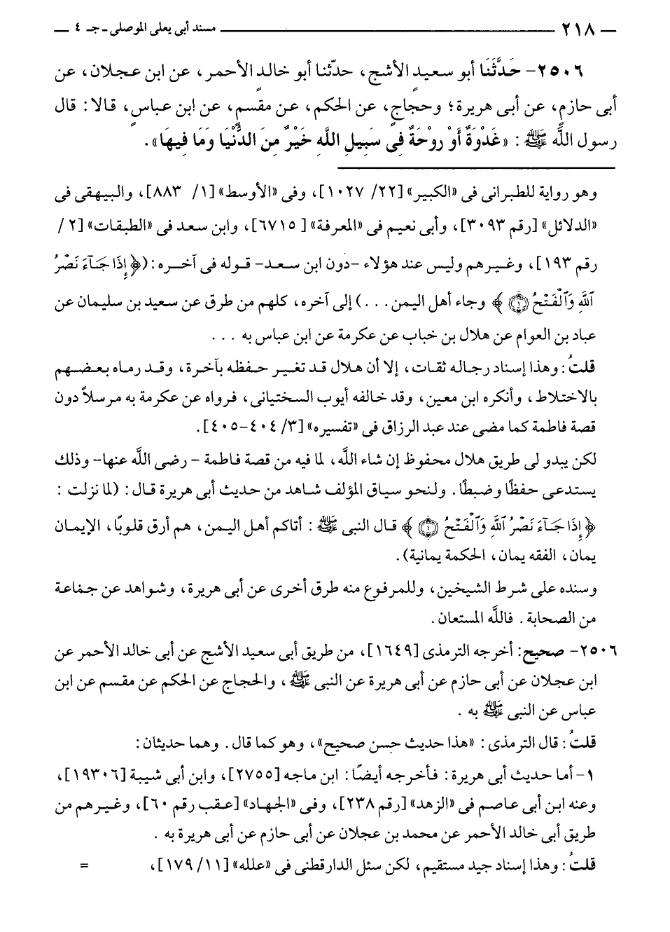 ٢٥٠٦ - حَدَّثَنَا أبو سعيدٍ الأشج، حدّثنا أبو خالدٍ الأحمر، عن ابن عجلان، عن أبى حازمٍ، عن أبى هريرة؛ وحجاجٍ، عن الحكم، عن مقسمٍ، عن ابن عباسٍ، قالا: قال رسول الله - صلى الله عليه وسلم -: "غَدْوَةٌ أَوْ روْحَةٌ فِي سَبِيلِ اللَّهِ خَيْرٌ مِنَ الدُّنْيَا وَمَا فِيهَا".