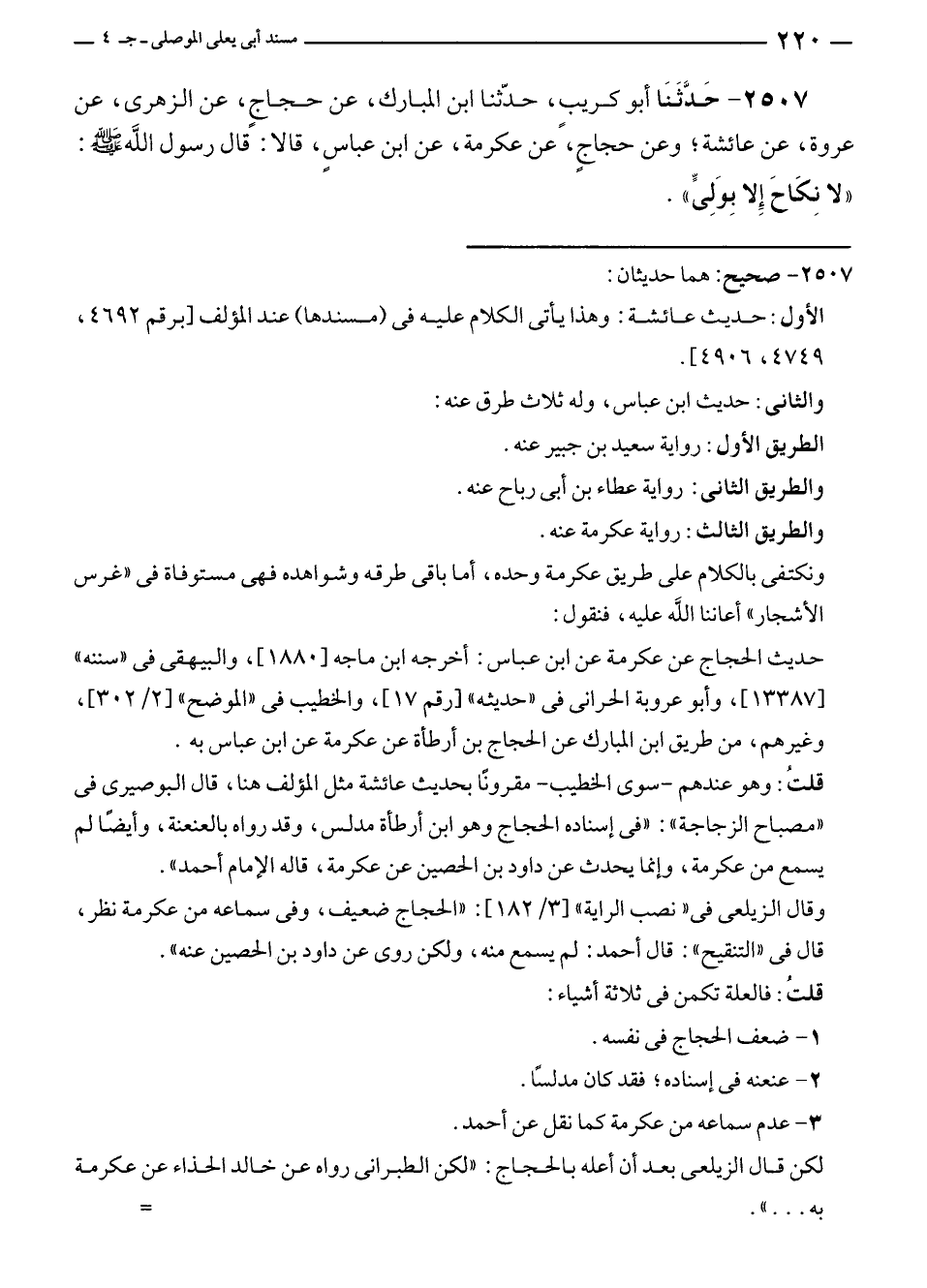 ٢٥٠٧ - حَدَّثَنَا أبو كريبٍ، حدّثنا ابن المبارك، عن حجاجٍ، عن الزهرى، عن عروة، عن عائشة؛ وعن حجاجٍ عن عكرمة، عن ابن عباسٍ، قالا: قال رسول الله - صلى الله عليه وسلم -: "لا نِكَاحَ إِلا بِوَلِيٍّ".