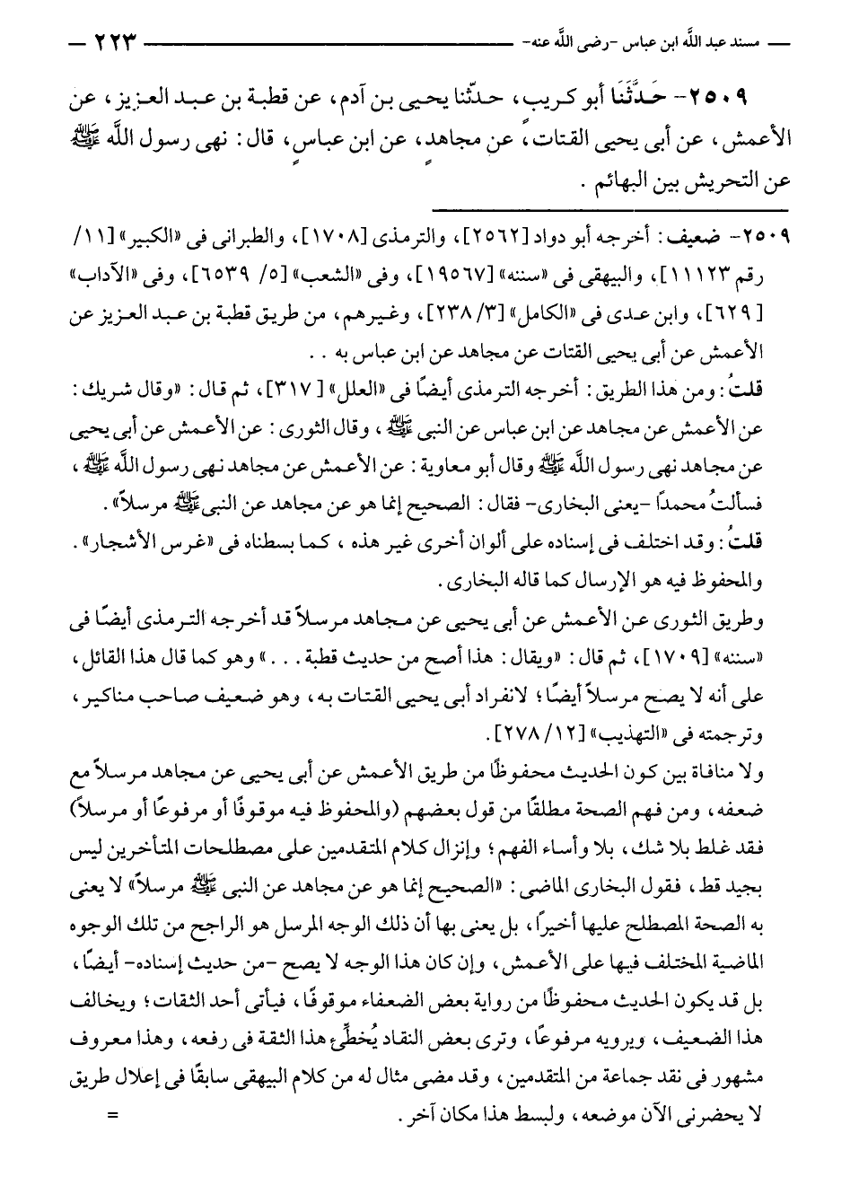 ٢٥٠٩ - حَدَّثَنَا أبو كريبٍ، حدّثنا يحيى بن آدم، عن قطبة بن عبد العزيز، عن الأعمش، عن أبى يحيى القتات، عن مجاهدٍ، عن ابن عباسٍ، قال: نهى رسول الله - صلى الله عليه وسلم - عن التحريش بين البهائم.