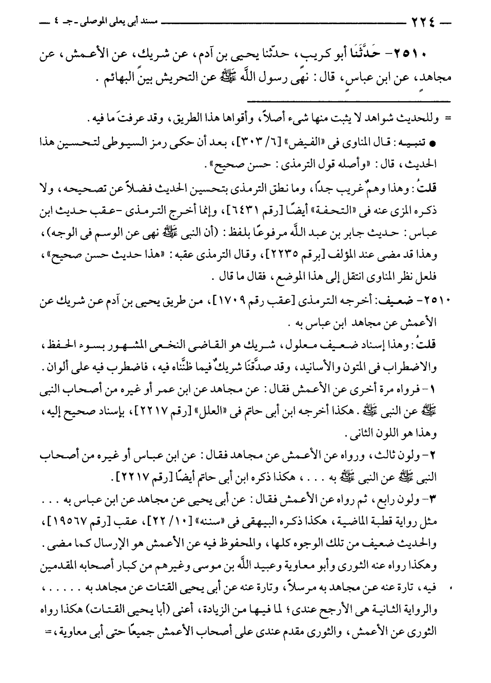 ٢٥١٠ - حَدَّثَنَا أبو كريبٍ، حدّثنا يحيى بن آدم، عن شريكٍ، عن الأعمش، عن مجاهدٍ، عن ابن عباسٍ، قال: نهى رسول الله - صلى الله عليه وسلم - عن التحريش بين البهائم.