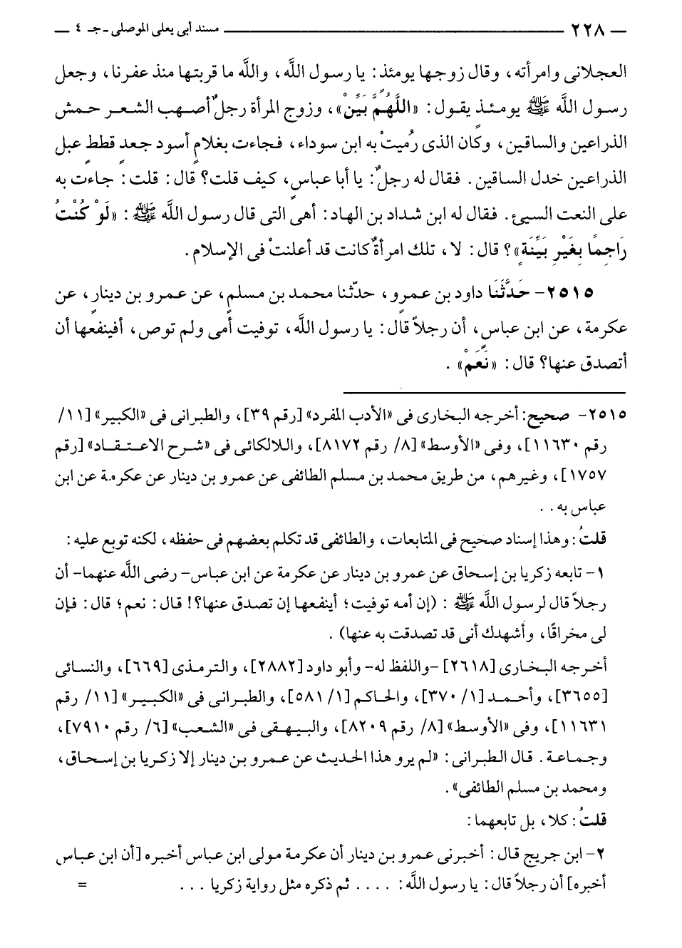 ٢٥١٥ - حَدَّثَنَا داود بن عمرٍو، حدّثنا محمد بن مسلمٍ، عن عمرو بن دينارٍ، عن عكرمة، عن ابن عباسٍ، أن رجلًا قال: يا رسول الله، توفيت أمى ولم توص، أفينفعها أن أتصدق عنها؟ قال: "نَعَمْ".