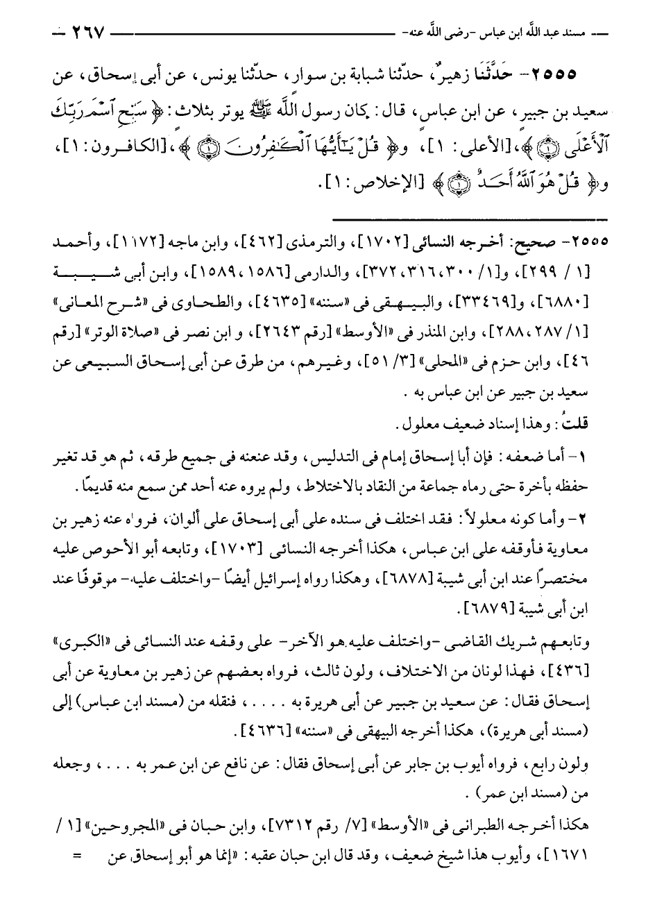 ٢٥٥٥ - حَدَّثَنَا زهيرٌ، حدّثنا شبابة بن سوارٍ، حدّثنا يونس، عن أبى إسحاق، عن سعيد بن جبيرٍ، عن ابن عباسٍ، قال: كان رسول الله - صلى الله عليه وسلم - يوتر بثلاثٍ: {سَبِّحِ اسْمَ رَبِّكَ الْأَعْلَى (١)} [الأعلى: ١]، و {قُلْ يَاأَيُّهَا الْكَافِرُونَ (١)} [الكافرون: ١]، و {قُلْ هُوَ اللَّهُ أَحَدٌ (١)} [الإخلاص: ١].