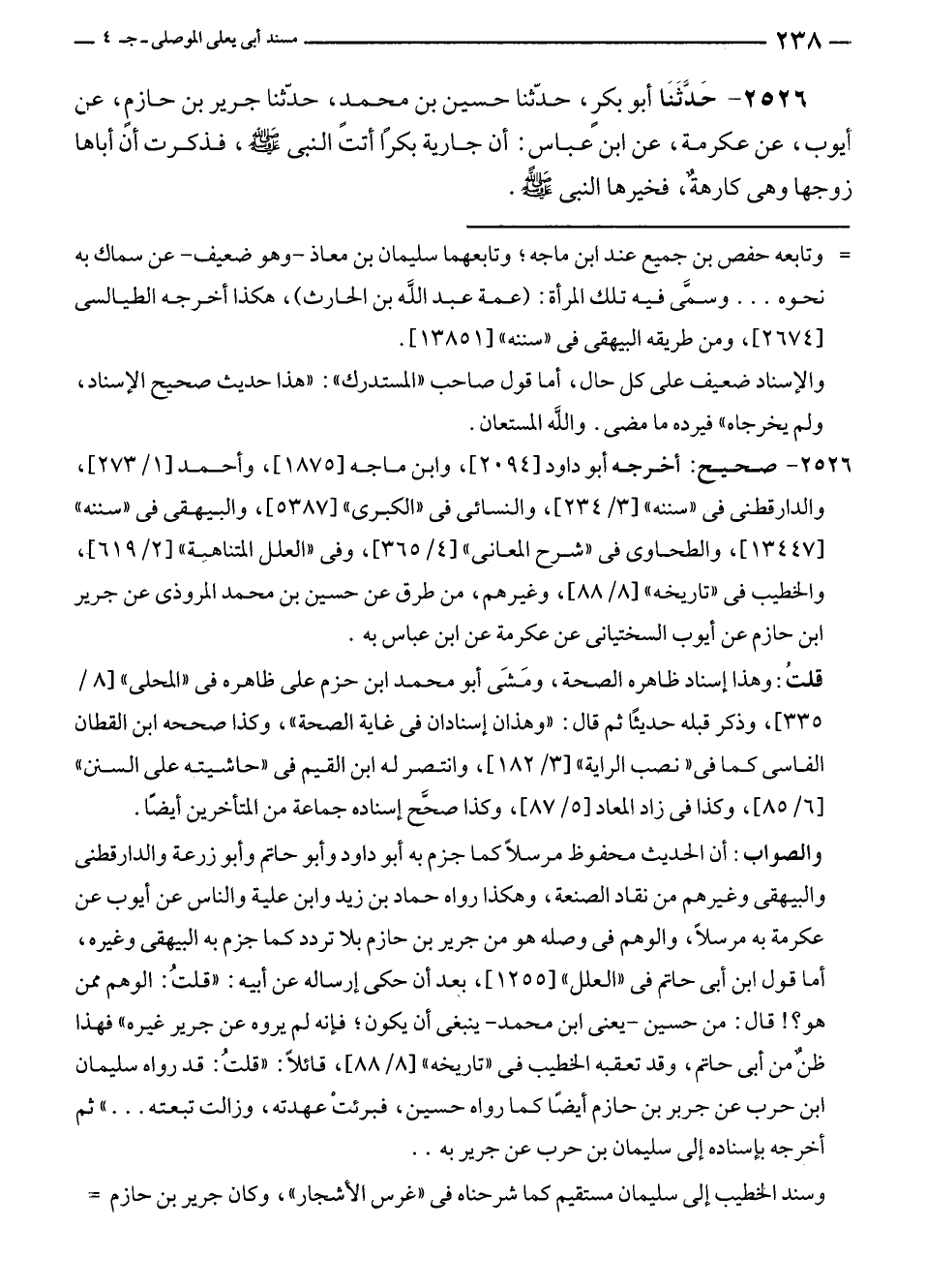 والصواب: أن الحديث محفوظ مرسلًا كما جزم به أبو داود وأبو حاتم وأبو زرعة والدارقطنى والبيهقى وغيرهم من نقاد الصنعة، وهكذا رواه حماد بن زيد وابن علية والناس عن أيوب عن عكرمة به مرسلًا، والوهم في وصله هو من جرير بن حازم بلا تردد كما جزم به البيهقى وغيره، أما قول ابن أبى حاتم في "العلل" [١٢٥٥]، بعد أن حكى إرساله عن أبيه: "قلتُ: الوهم ممن هو؟! قال: من حسين - يعنى ابن محمد - ينبغى أن يكون؛ فإنه لم يروه عن جرير غيره" فهذا ظنٌ من أبى حاتم، وقد تعقبه الخطيب في "تاريخه" [٨/ ٨٨]، قائلًا: "قلتُ: قد رواه سليمان بن حرب عن جربر بن حازم أيضًا كما رواه حسين، فبرئتْ عهدته، وزالت تبعته ... " ثم أخرجه بإسناده إلى سليمان بن حرب عن جرير به ..