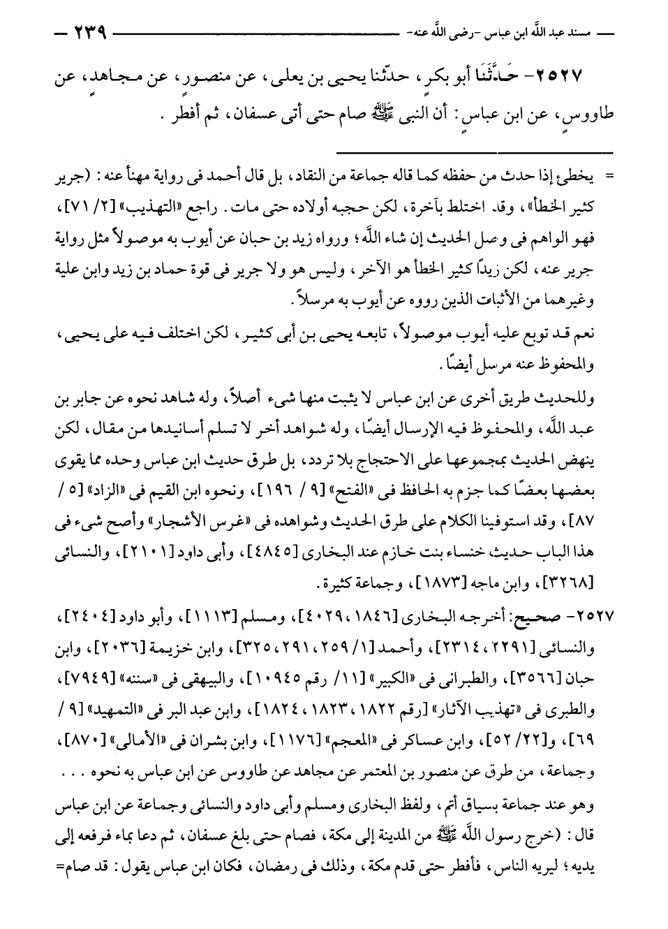 ٢٥٢٧ - صحيح: أخرجه البخارى [١٨٤٦، ٤٠٢٩]، ومسلم [١١١٣]، وأبو داود [٢٤٥٤]، والنسائى [٢٣١٤،٢٢٩١]، وأحمد [١/ ٢٥٩، ٢٩١، ٣٢٥]، وابن خزيمة [٢٠٣٦]، وابن حبان [٣٥٦٦] والطبرانى في "الكبير" [١١/ رقم ١٠٩٤٥]، والبيهقى في "سننه" [٧٩٤٩]، والطبرى في "تهذيب الاثار" [رقم ١٨٢٢، ١٨٢٣، ١٨٢٤]، وابن عبد البر في "التمهيد" [٩/ ٦٩]، و [٢٢/ ٥٢]، وابن عساكر في "المعجم" [١١٧٦]، وابن بشران في "الأمالى" [٨٧٠]، وجماعة، من طرق عن منصور بن المعتمر عن مجاهد عن طاووس عن ابن عباس به نحوه ... وهو عند جماعة بسياق أتم، ولفظ البخارى ومسلم وأبى داود والنسائى وجماعة عن ابن عباس قال: (خرج رسول الله - صلى الله عليه وسلم - من المدينة إلى مكة، فصام حتى بلغ عسفان، ثم دعا بماء فرفعه إلى يديه؛ ليريه الناس، فأفطر حتى قدم مكة، وذلك في رمضان، فكان ابن عباس يقول: قد صام=