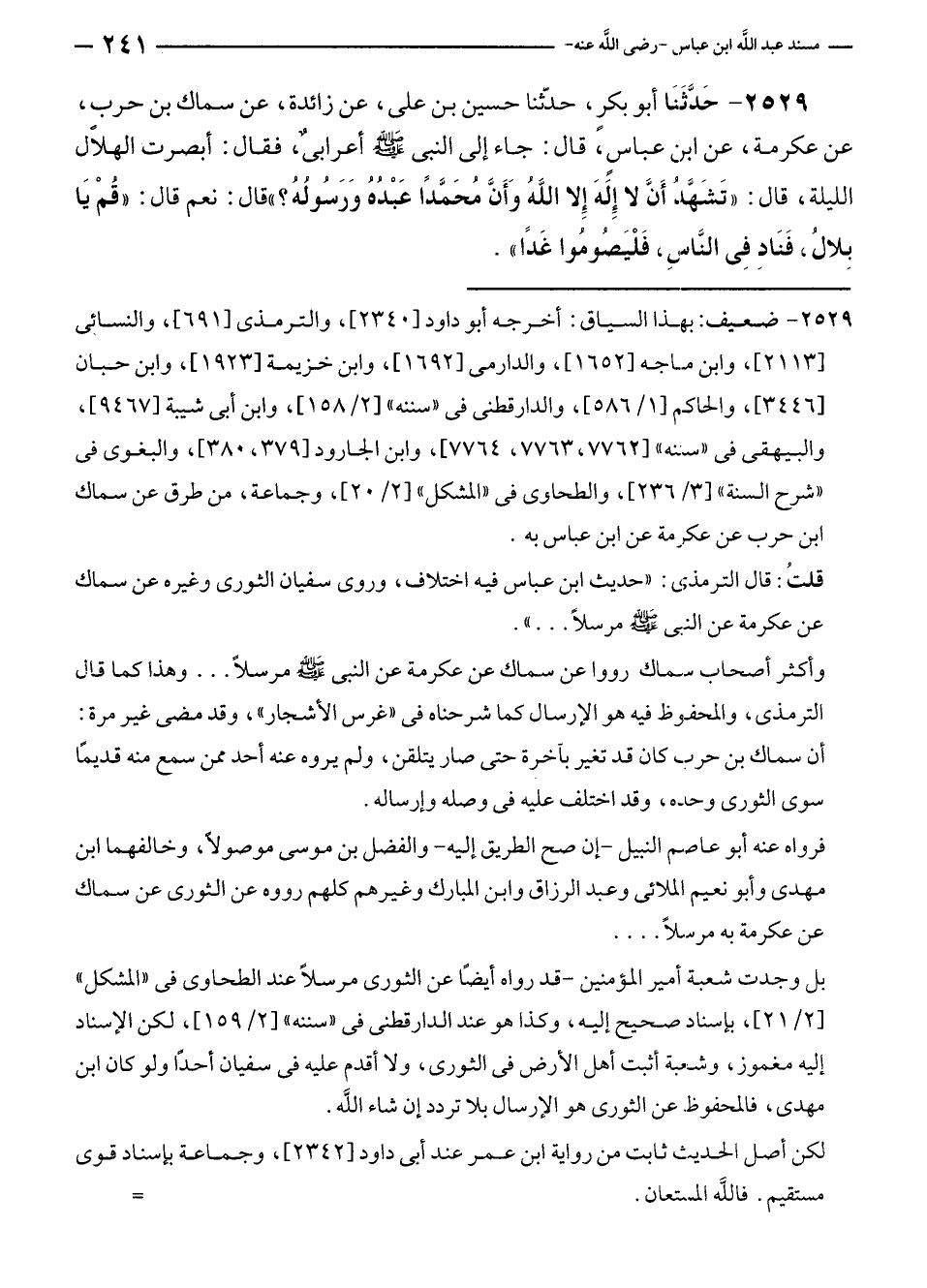 ٢٥٢٩ - حَدَّثَنَا أبو بكرٍ، حدّثنا حسين بن على، عن زائدة، عن سماك بن حربٍ، عن عكرمة، عن ابن عباسٍ، قال: جاء إلى النبي - صلى الله عليه وسلم - أعرابىٌ، فقال: أبصرت الهلال الليلة، قال: "تَشَهَدُ أَنَّ لا إِلَهَ إِلا اللهُ وَأَنَّ مُحَمَّدًا عَبْدُهُ وَرَسُولُهُ؟ "قال: نعم قال: "قُمْ يَا بِلالُ، فَنَادِ فِي النَّاسِ، فَلْيَصُومُوا غَدًا".