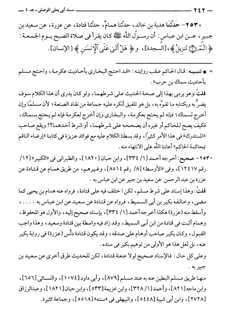 ٢٥٣٠ - حَدَّثَنَا هدبة بن خالدٍ، حدّثنا همامٌ، حدّثنا قتادة، عن عزرة، عن سعيد بن جبيرٍ، عن ابن عباسٍ: أن رسول الله - صلى الله عليه وسلم - كان يقرأ في صلاة الصبح يوم الجمعة: {الم (١) تَنْزِيلُ}، [السجدة]، و {هَلْ أَتَى عَلَى الْإِنْسَانِ} [الإنسان].