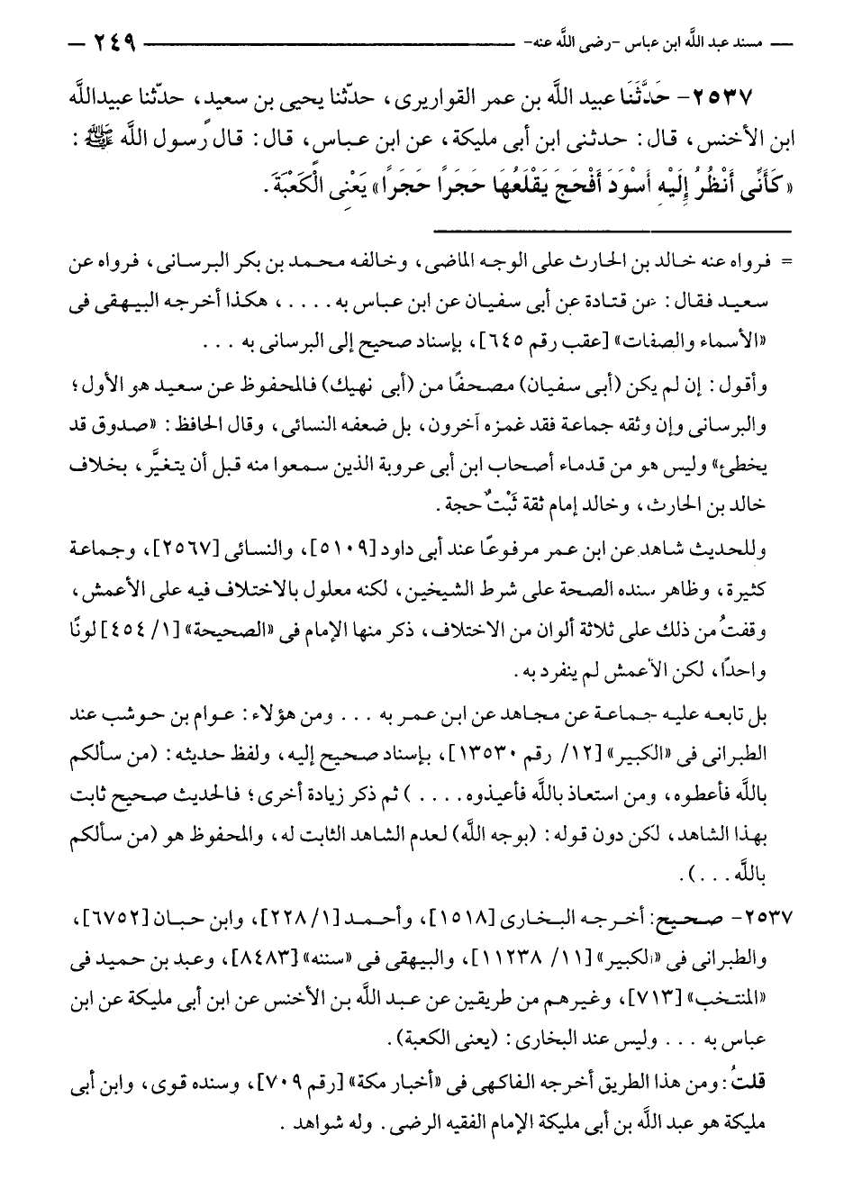 ٢٥٣٧ - حَدَّثَنَا عبيد الله بن عمر القواريرى، حدّثنا يحيى بن سعيدٍ، حدّثنا عبيد اللَّه بن الأخنس، قال: حدثنى ابن أبى مليكة، عن ابن عباسٍ، قال: قال رسول الله - صلى الله عليه وسلم -: "كَأَنِّى أَنْظُر إِلَيْهِ أَسْوَدَ أَفْحَجَ يَقْلَعُهَا حَجَرًا حَجَرًا" يَعْنِى الْكَعْبَةَ.