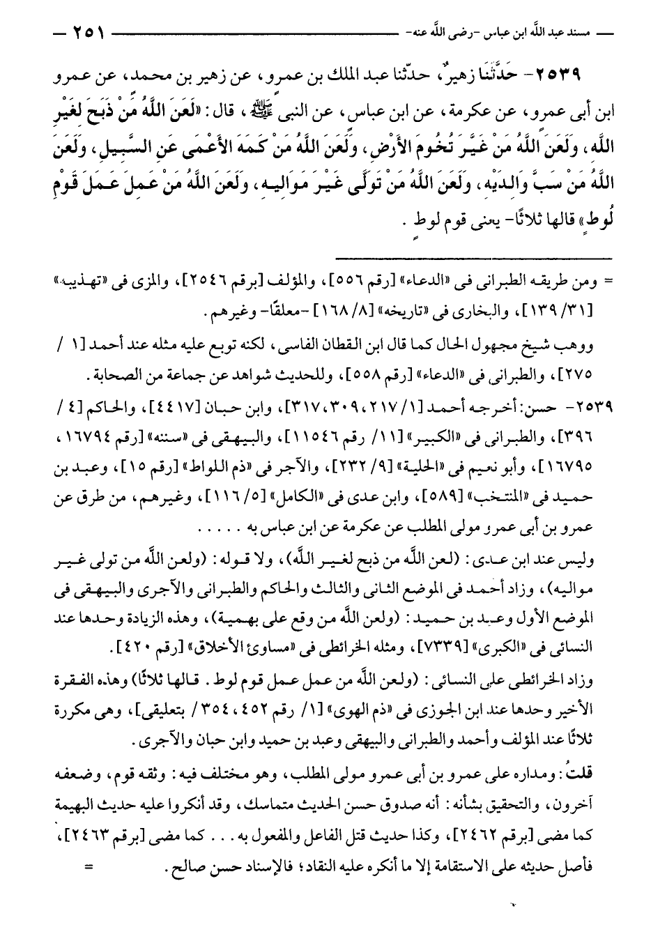 ٢٥٣٩ - حَدَّثَنَا زهيرٌ، حدّثنا عبد الملك بن عمرٍو، عن زهير بن محمدٍ، عن عمرو بن أبى عمرو، عن عكرمة، عن ابن عباسٍ، عن النبي - صلى الله عليه وسلم -، قال: "لَعَنَ اللَّهُ مَنْ ذَبَحَ لِغَيْرِ اللَّهِ، وَلَعَنَ اللَّهُ مَنْ غَيَّرَ تُخُومَ الأَرْضِ، وَلَعَنَ اللَّهُ مَنْ كَمَهَ الأَعْمَى عَنِ السَّبِيلِ، وَلَعَنَ اللَّهَ مَنْ سَبَّ وَالِدَيْهِ، وَلَعَنَ الله مَنْ تَوَلَّى غَيْرَ مَوَالِيهِ، وَلَعَنَ اللَّهُ مَنْ عَمِلَ عَمَلَ قَوْمِ لُوطٍ" قالها ثلاثًا - يعنى قوم لوطٍ.