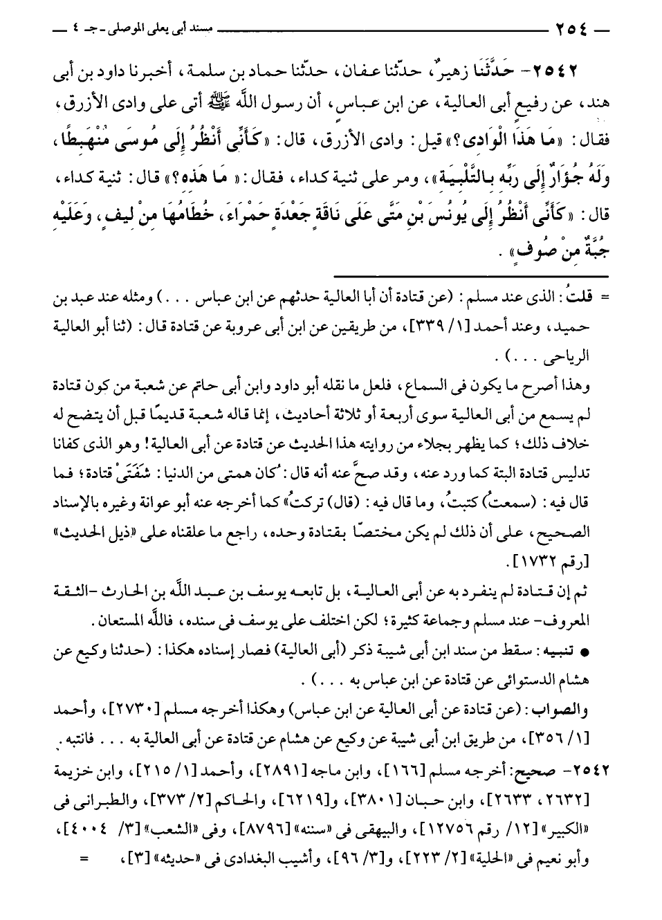 ٢٥٤٢ - حَدَّثَنَا زهيرٌ، حدّثنا عفان، حدّثنا حماد بن سلمة، أخبرنا داود بن أبى هند، عن رفيعٍ أبى العالية، عن ابن عباسٍ، أن رسول الله - صلى الله عليه وسلم - أتى على وادى الأزرق، فقال: "مَا هَذَا الْوَادِى؟ " قيل: وادى الأزرق، قال: "كَأَنِّى أَنْظُرُ إلَى مُوسَى مُنْهَبِطًا، وَلَهُ جُؤَارٌ إِلَى رَبِّهِ بِالتَّلْبِيَةِ"، ومر على ثنية كداء، فقال: "مَا هَذِهِ؟ " قال: ثنية كداء، قال: "كَأنِّى أَنْظُرُ إِلَى يُونُسَ بْنِ مَتَّى عَلَى نَاقَةٍ جَعْدَةٍ حَمْرَاءَ، خُطَامُهَا مِنْ لِيفٍ، وَعَلَيْهِ جُبَّةٌ مِنْ صُوفٍ".