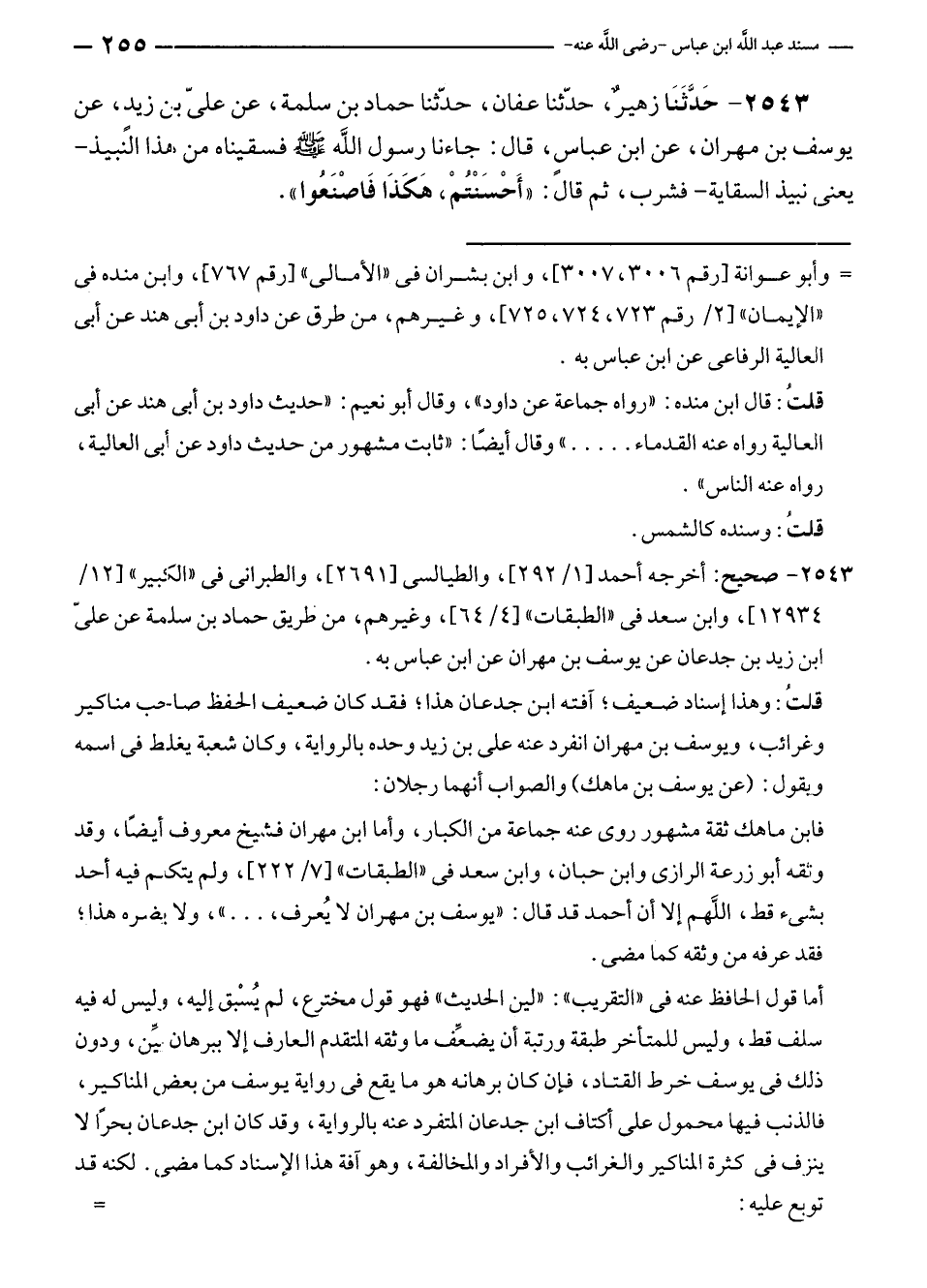 ٢٥٤٣ - حَدَّثَنَا زهيرٌ، حدّثنا عفان، حدّثنا حماد بن سلمة، عن عليّ بن زيدٍ، عن يوسف بن مهران، عن ابن عباسٍ، قال: جاءنا رسول الله - صلى الله عليه وسلم - فسقيناه من هذا النبيذ - يعني نبيذ السقاية - فشرب، ثم قال: "أَحْسَنْتُمْ، هَكَذَا فَاصْنَعُوا".