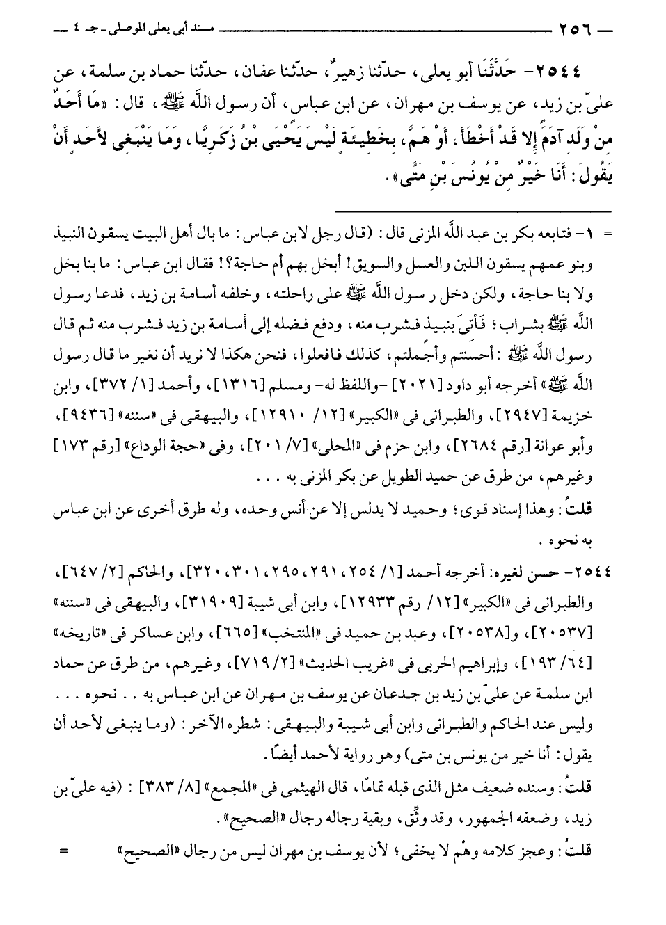 ٢٥٤٤ - حَدَّثَنَا أبو يعلى، حدّثنا زهيرٌ، حدّثنا عفان، حدّثنا حماد بن سلمة، عن عليّ بن زيدٍ، عن يوسف بن مهران، عن ابن عباسٍ، أن رسول الله - صلى الله عليه وسلم -، قال: "مَا أَحَدٌ مِنْ وَلَدِ آدَمَ إِلا قَدْ أَخْطَأَ، أَوْ هَمَّ، بِخَطِيئَةٍ لَيْسَ يَحْيَى بْنُ زَكَرِيَّا، وَمَا يَنْبَغِى لأَحَدٍ أَنْ يَقُولَ: أَنَا خيْرٌ مِنْ يُونُسَ بْنِ مَتَّى".