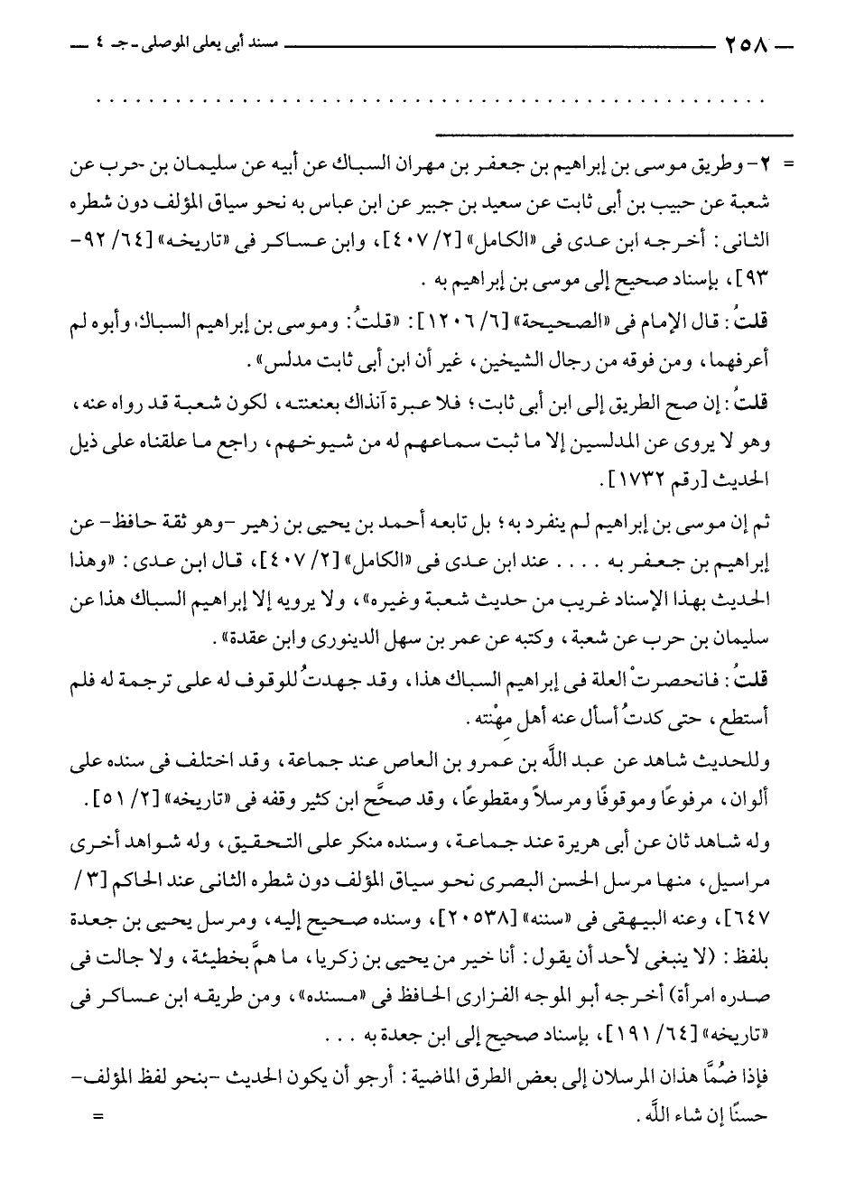 ثم إن موسى بن إبراهيم لم ينفرد به؛ بل تابعه أحمد بن يحيى بن زهير - وهو ثقة حافظ - عن إبراهيم بن جعفر به .... عند ابن عدى في "الكامل" [٢/ ٤٠٧]، قال ابن عدى: "وهذا الحديث بهذا الإسناد غريب من حديث شعبة وغيره"، ولا يرويه إلا إبراهيم السباك هذا عن سليمان بن حرب عن شعبة، وكتبه عن عمر بن سهل الدينورى وابن عقدة".