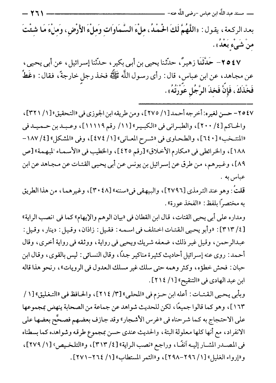 ٢٥٤٧ - حَدَّثَنَا زهيرٌ، حدّثنا يحيى بن أبى بكيرٍ، حدّثنا إسرائيل، عن أبى يحيى، عن مجاهدٍ، عن ابن عباسٍ، قال: رأى رسول الله - صلى الله عليه وسلم - فخذ رجلٍ خارجةً، فقال: "غَطِّ فَخَذَكَ، فَإِن فَخِذَ الرَّجُلِ عَوْرَتُهُ".