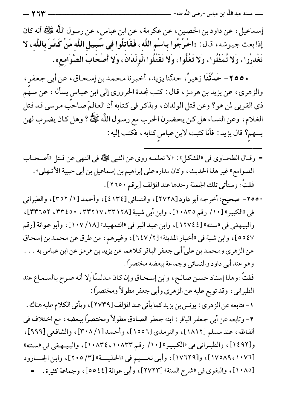 ٢٥٥٠ - صحيح: أخرجه أبو داود [٢٧٢٨]، والنسائى [٤١٣٤]، وأحمد [١/ ٣٥٢]، والطبرانى في "الكبير" [١٠/ رقم ١٠٨٣٥]، وابن أبى شيبة [٣٣١٢٨، ٣٣٢١٧، ٣٣٤٥٠، ٣٣٦٥٢]، والبيهقى في "سننه" [١٢٧٤٤]، وابن عبد البر في "التمهيد" [١٨/ ١٠٧]، وأبو عوانة [رقم /٥٥٤٧]، وابن شبة في "أخبار المدينة" [٢/ ٦٤٧]، وغيرهم، من طرق عن محمد، بن إسحاق عن الزهرى ومحمد بن عليّ أبى جعفر الباقر كلاهما عن يزيد بن هرمز عن ابن عباس به. . . وهو عند أبى داود والنسائى وجماعة ببعضه مختصرًا.