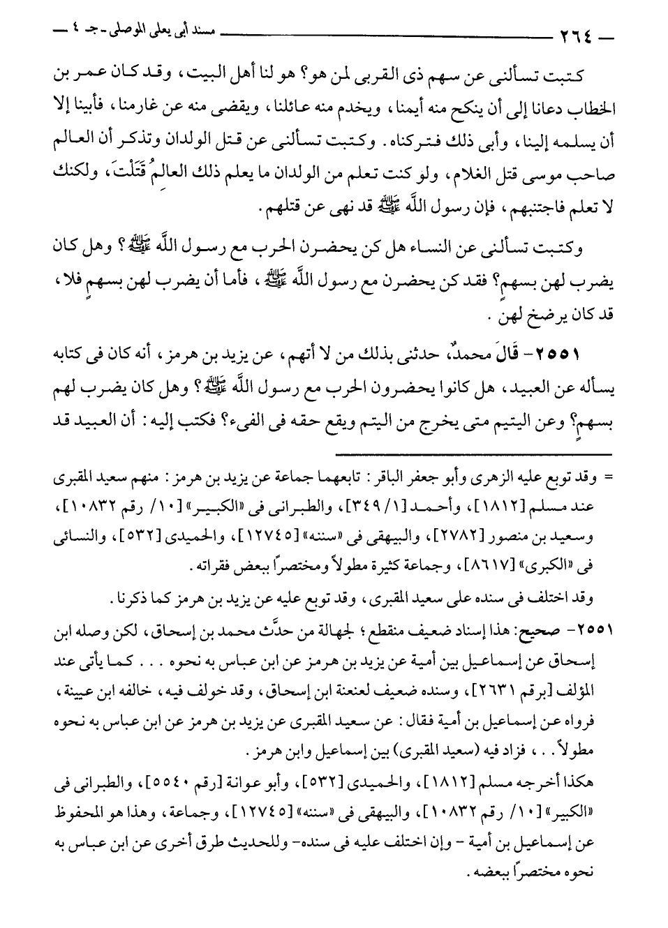 ٢٥٥١ - قَالَ محمدٌ، حدثنى بذلك من لا أتهم، عن يزيد بن هرمز، أنه كان في كتابه يسأله عن العبيد، هل كانوا يحضرون الحرب مع رسول الله - صلى الله عليه وسلم -؟ وهل كان يضرب لهم بسهمٍ؟ وعن اليتيم متى يخرج من اليتم ويقع حقه في الفئ؟ فكتب إليه: أن العبيد قد