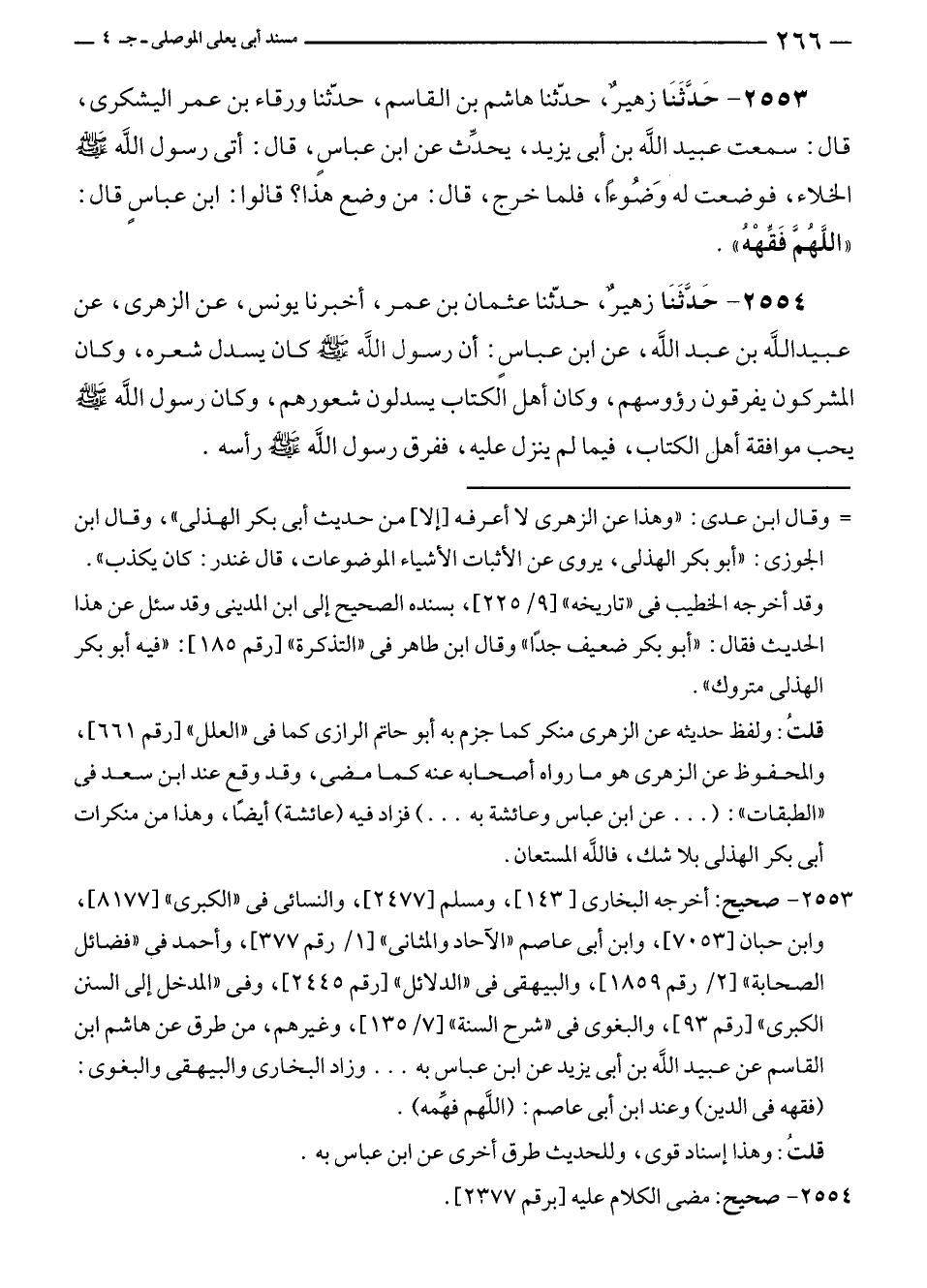 ٢٥٥٣ - حَدَّثَنَا زهيرٌ، حدّثنا هاشم بن القاسم، حدثنا ورقاء بن عمر اليشكرى، قال: سمعت عبيد الله بن أبى يزيد، يحدِّث عن ابن عباسٍ، قال: أتى رسول الله - صلى الله عليه وسلم - الخلاء، فوضعت له وَضُوءًا، فلما خرج، قال: من وضع هذا؟ قالوا: ابن عباسٍ قال: "اللَّهُمَّ فَقِّهْهُ".