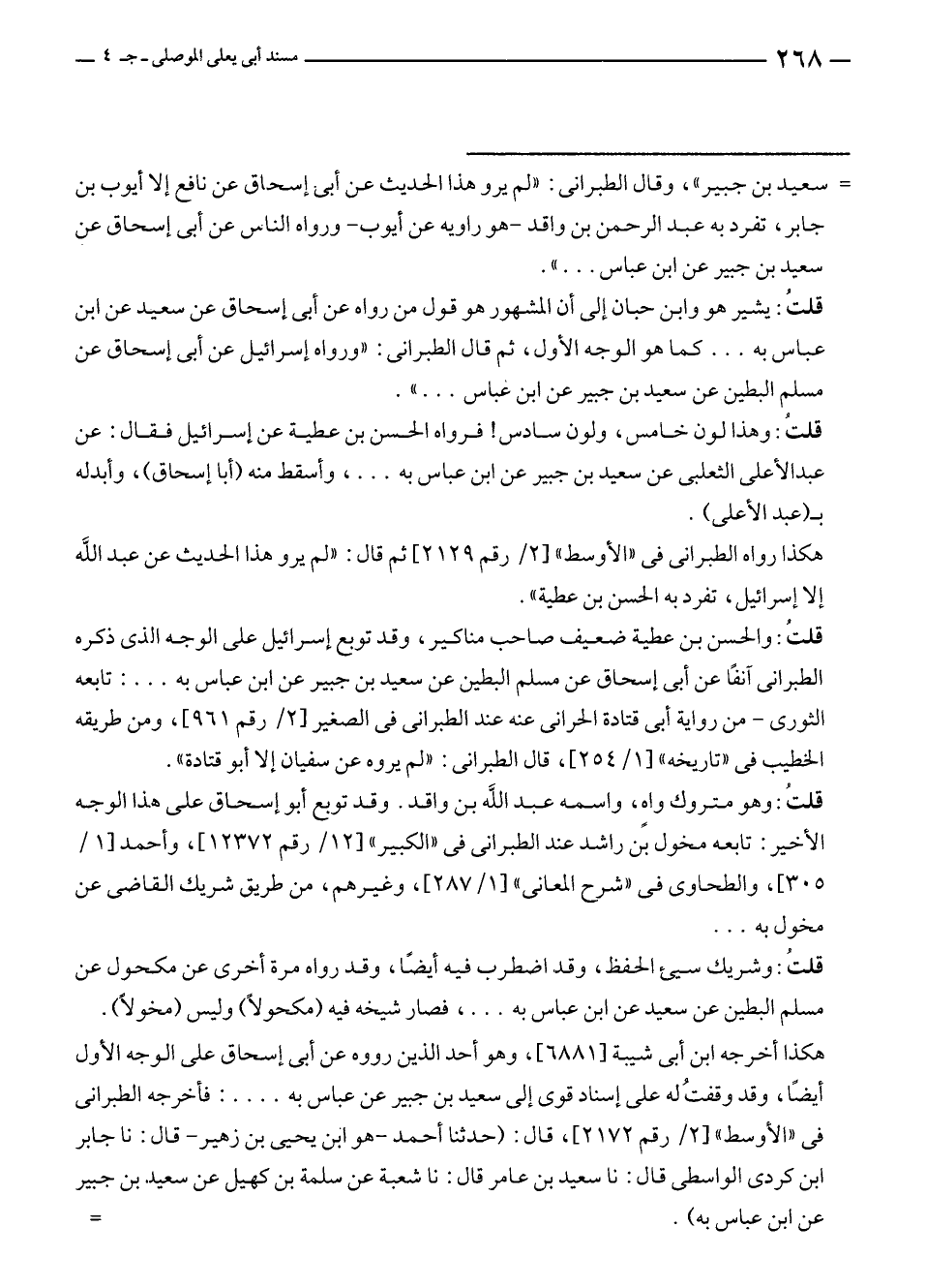 = سعيد بن جبير"، وقال الطبراني: "لم يرو هذا الحديث عن أبى إسحاق عن نافع إلا أيوب بن جابر، تفرد به عبد الرحمن بن واقد - هو راويه عن أيوب - ورواه الناس عن أبى إسحاق عن سعيد بن جبير عن ابن عباس ... ".