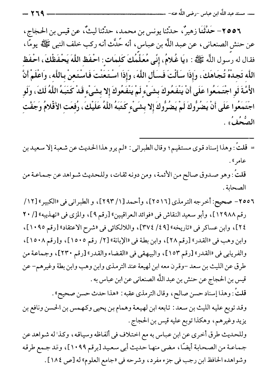 ٢٥٥٦ - حَدَّثَنَا زهيرٌ، حدّثنا يونس بن محمدٍ، حدّثنا ليثٌ، عن قيس بن الحجاج، عن حنشٍ الصنعانى، عن عبد الله بن عباسٍ، أنه حدَّث أنه ركب خلف النبي - صلى الله عليه وسلم - يومًا، فقال له رسول الله - صلى الله عليه وسلم -: "يَا غُلامُ، إِنِّي مُعَلِّمُكَ كَلِمَاتٍ: احْفَظِ اللَّهَ يَحْفَظْكَ، احْفَظِ الله تَجِدْهُ تُجَاهَكَ، وَإِذَا سَأَلْتَ فَسَأَلِ اللَّهَ، وَإِذَا اسْتَعَنْتَ فَاسْتَعِنْ بِالله، وَاعْلَمْ أَنَّ الأمَّةَ لَوِ اجْتَمَعُوا عَلَى أَنْ يَنْفَعُوكَ بِشَىْءٍ لَمْ يَنْفَعُوكَ إِلا بِشَىْءٍ قَدْ كَتَبَهُ الله لَكَ، وَلَوِ اجْتَمَعُوا عَلَى أَنْ يَضُرُّوكَ لَمْ يَضُرُّوكَ إِلا بِشَىْءٍ كَتَبَهُ اللهُ عَلَيْكَ، رُفِعَتِ الأَقْلامُ وَجَفَّتِ الصُّحُف".