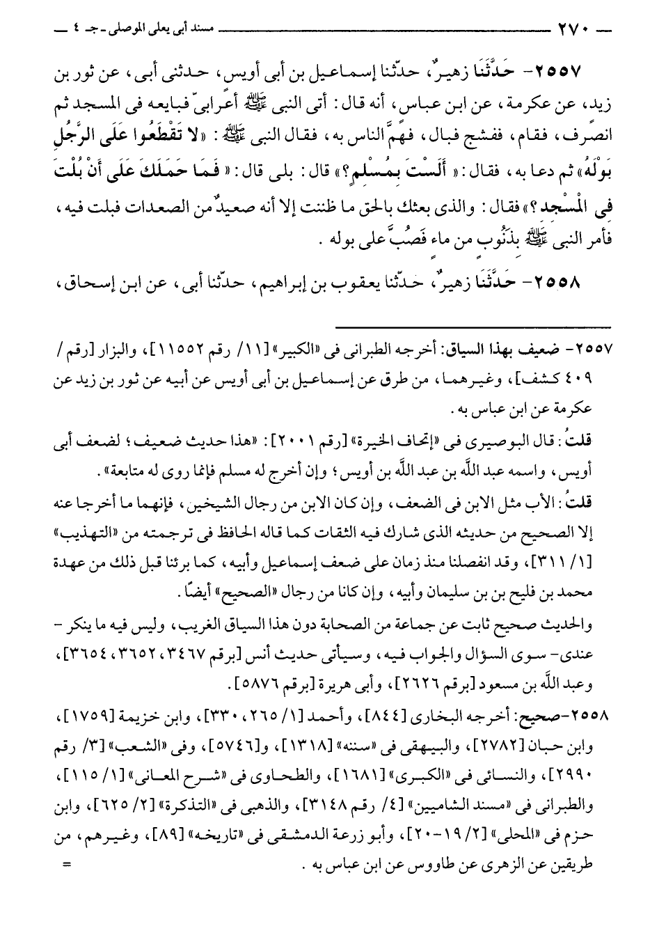 ٢٥٥٧ - حَدَّثَنَا زهيرٌ، حدّثنا إسماعيل بن أبى أويسٍ، حدثنى أبى، عن ثور بن زيدٍ، عن عكرمة، عن ابن عباسٍ، أنه قال: أتى النبي - صلى الله عليه وسلم - أعرابيّ فبايعه في المسجد ثم انصرف، فقام، ففشج فبال، فهَمَّ الناس به، فقال النبي - صلى الله عليه وسلم -: "لا تَقْطَعُوا عَلَى الرَّجُلِ بَوْلَهُ" ثم دعا به، فقال: "أَلَسْتَ بِمُسْلِمٍ؟ " قال: بلى قال: "فَمَا حَمَلَكَ عَلَى أَنْ بُلْتَ فِي المسْجِدِ؟ " فقال: والذى بعثك بالحق ما ظننت إلا أنه صعيدٌ من الصعدات فبلت فيه، فأمر النبي - صلى الله عليه وسلم - بِذَنُوبٍ من ماءٍ فَصُبَّ على بوله.