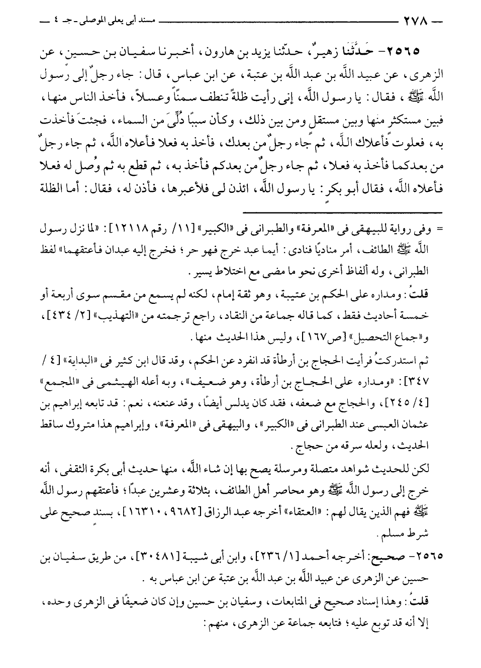 لكن للحديث شواهد متصلة ومرسلة يصح بها إن شاء الله، منها حديث أبى بكرة الثقفى، أنه خرج إلى رسول الله - صلى الله عليه وسلم - وهو محاصر أهل الطائف، بثلاثة وعشرين عبدًا؛ فأعتقهم رسول الله - صلى الله عليه وسلم - فهم الذين يقال لهم: "العتقاء" أخرجه عبد الرزاق [٩٦٨٢، ١٦٣١٠]، بسند صحيح على شرط مسلم.