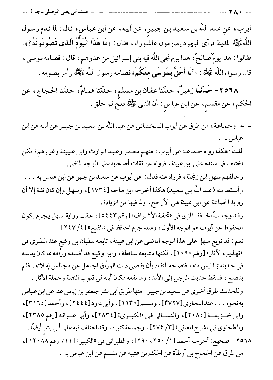 أيوب، عن عبد الله بن سعيد بن جبيرٍ، عن أبيه، عن ابن عباسٍ، قال: لما قدم رسول الله - صلى الله عليه وسلم - المدينة فرأى اليهود يصومون عاشوراء، فقال: "مَا هَذَا الْيَوْمُ الَّذِى تَصُومُونَهُ؟ ". فقالوا: هذا يومٌ صالحٌ، هذا يوم نجى الله فيه بنى إسرائيل من عدوهم، قال: فصامه موسى، قال رسول الله - صلى الله عليه وسلم -: "أَنَا أَحَقُّ بِمُوسَى مِنْكمْ" فصامه رسول الله - صلى الله عليه وسلم - وأمر بصومه.
