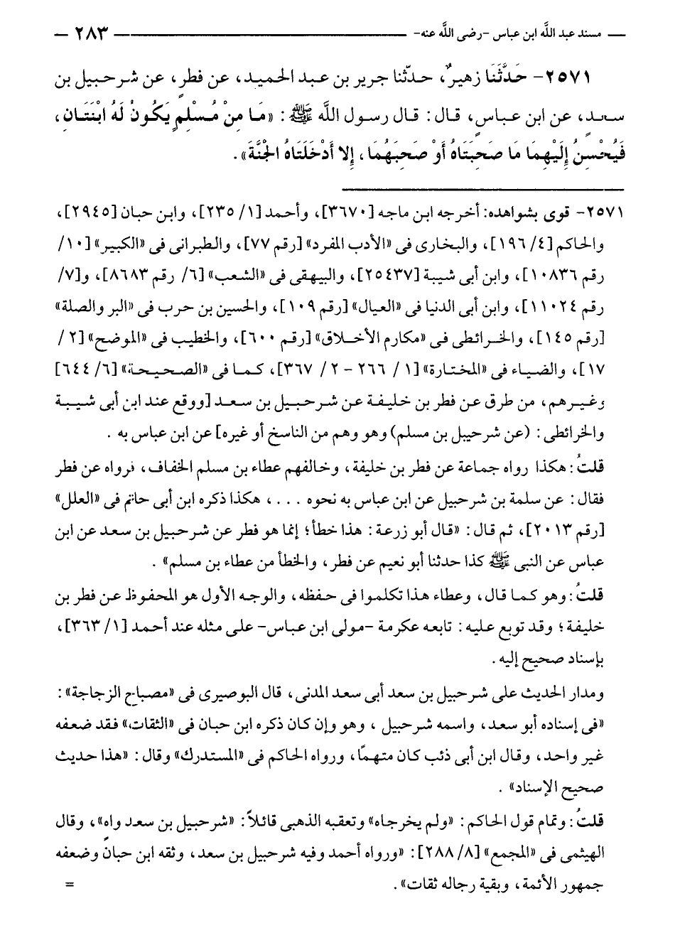 ٢٥٧١ - حَدَّثَنَا زهيرٌ، حدّثنا جرير بن عبد الحميد، عن فطرٍ، عن شرحبيل بن سعدٍ، عن ابن عباسٍ، قال: قال رسول الله - صلى الله عليه وسلم -: "مَا مِنْ مُسْلِمٍ يَكُونُ لَهُ ابْنَتَانِ، فَيُحْسِنُ إِلَيْهِمَا مَا صَحِبَتَاهُ أَوْ صَحِبَهُمَا، إِلا أَدْخَلَتَاهُ الجَنَّةَ".