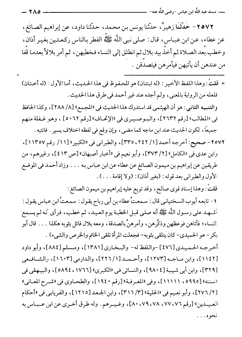 ٢٥٧٢ - حَدَّثَنَا زهيرٌ، حدّثنا يونس بن محمدٍ، حدّثنا داود، عن إبراهيم الصائغ، عن عطاءٍ، عن ابن عباسٍ، قال: صلى نبى الله - صلى الله عليه وسلم - الفطر بالناس ركعتين بغير أذانٍ، وخطب بعد الصلاة ثم أخذ بيد بلالٍ ثم انطلق إلى النساء فخطبهن، ثم أمر بلالًا بعدما قفا من عندهن أن يأتيهن فيأمرهن فيتصدقن.