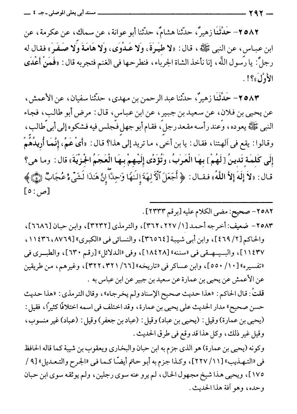 ٢٥٨٣ - حَدَّثَنَا زهيرٌ، حدّثنا عبد الرحمن بن مهدى، حدّثنا سفيان، عن الأعمش، عن يحيى بن فلانٍ، عن سعيد بن جبيرٍ، عن ابن عباسٍ، قال: مرض أبو طالبٍ، فجاء النبي - صلى الله عليه وسلم - يعوده، وَعند رأسه مقعد رجلٍ، فقام أبو جهلٍ فَجلس فيه فشكوه إلى أبى طالبٍ، وقالوا: يقع في آلهتنا، فقال: يا بن أخى، ما تريد إلى هذا؟ قال: "أَىْ عَمِّ، إِنَّمَا أريدُهُمْ إِلَى كَلِمَةٍ تَدِين [لَهُمْ] بِهَا الْعَرَبُ، وَتُؤَدِّى إلَيْهِمْ بِهَا الْعَجَمُ الْجزْيَةَ" قال: وما هي؟ قال: "لا إِلَهَ إِلَّا اللَّهُ" فقال: {أَجَعَلَ الْآلِهَةَ إِلَهًا وَاحِدًا إِنَّ هَذَا لَشَيْءٌ عُجَابٌ (٥)} [ص: ٥]