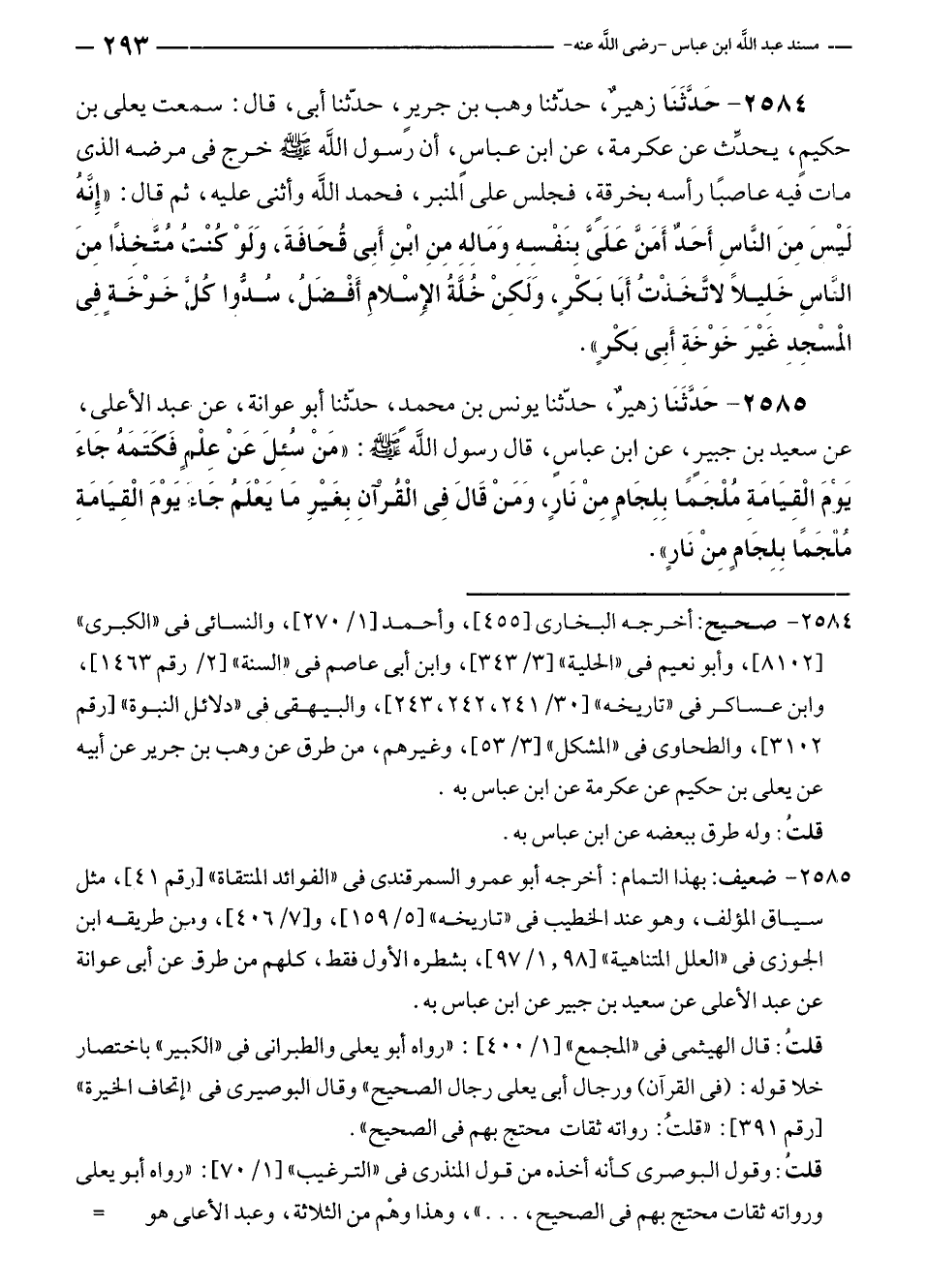 ٢٥٨٥ - حَدَّثَنَا زهيرٌ، حدّثنا يونس بن محمد، حدّثنا أبو عوانة، عن عبد الأعلى، عن سعيد بن جبيرٍ، عن ابن عباسٍ، قال رسول الله - صلى الله عليه وسلم -: "مَنْ سُئِلَ عَنْ عِلْمٍ فَكَتَمَهُ جَاءَ يَوْمَ الْقِيَامَةِ مُلْجَمًا بِلِجَامٍ مِنْ نَارٍ، وَمَنْ قَالَ فِي الْقُرآنِ بِغَيْرِ مَا يَعْلَمُ جَاءَ يَوْمَ الْقِيَامَةِ مُلْجَمًا بِلِجَامٍ مِنْ نَارٍ".