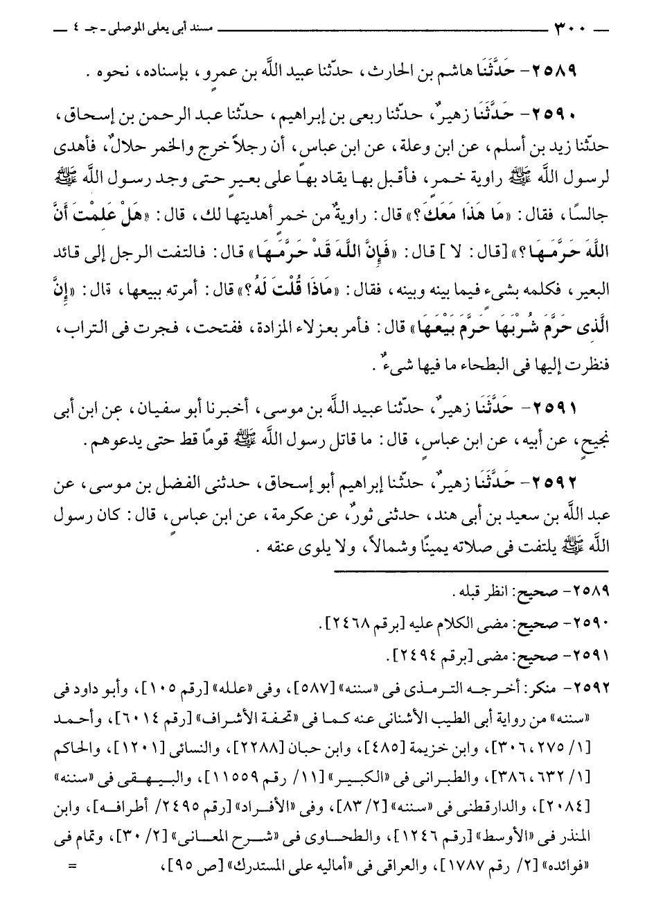 ٢٥٩٠ - حَدَّثَنَا زهيرٌ، حدّثنا ربعى بن إبراهيم، حدّثنا عبد الرحمن بن إسحاق، حدّثنا زيد بن أسلم، عن ابن وعلة، عن ابن عباسٍ، أن رجلًا خرج والخمر حلالٌ، فأهدى لرسول الله - صلى الله عليه وسلم - راوية خمرٍ، فأقبل بها يقاد بها على بعيرٍ حتى وجد رسول الله - صلى الله عليه وسلم - جالسًا، فقال: "مَا هَذَا مَعَكَ؟ " قال: راويةٌ من خمرٍ أهديتها لك، قال: "هَلْ عَلِمْتَ أَنَّ اللهَ حَرَّمَهَا؟ " [قال: لا] قال: "فَإِنَّ اللهَ قَدْ حَرَّمَهَا" قال: فالتفت الرجل إلى قائد البعير، فكلمه بشئٍ فيما بينه وبينه، فقال: "مَاذَا قُلْتَ لَهُ؟ " قال: أمرته ببيعها، قال: "إِنَّ الَّذِى حَرَّمَ شُرْبَهَا حَرَّمَ بَيْعَهَا" قال: فأمر بعزلاء المزادة، ففتحت، فجرت في التراب، فنظرت إليها في البطحاء ما فيها شئٌ.