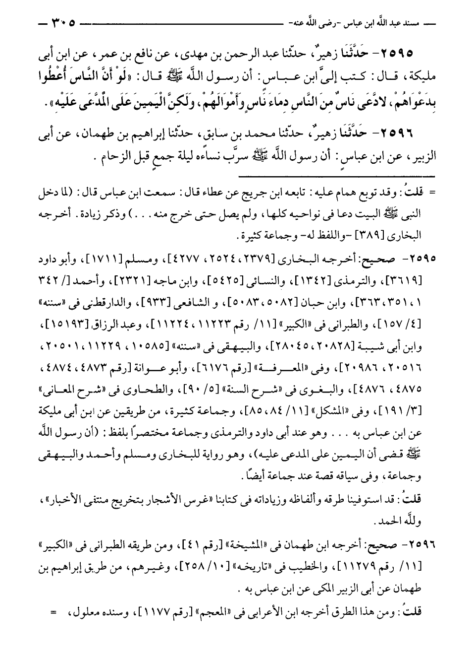 ٢٥٩٥ - حَدَّثَنَا زهيرٌ، حَدَّثَنَا عبد الرحمن بن مهدى، عن نافع بن عمر، عن ابن أبى مليكة، قال: كتب إليَّ ابن عباسٍ: أن رسول الله - صلى الله عليه وسلم - قال: "لَوْ أَنَّ النَّاسَ أُعْطُوا بِدَعْوَاهُمْ، لادَّعَى نَاسٌ مِنَ النَّاسِ دِمَاءَ نَاسٍ وَأَمْوَالَهُمْ، وَلَكِنَّ الْيَمِينَ عَلَى المُدَّعَى عَلَيْهِ".