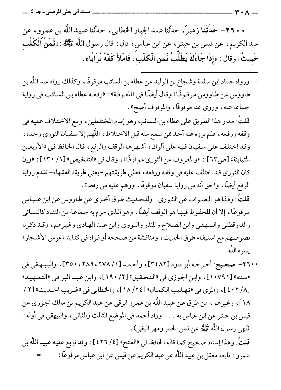 ٢٦٠٠ - صحيح: أخرجه أبو داود [٣٤٨٢]، وأحمد [١/ ٢٧٨، ٢٨٩، ٣٥٠]، والبيهقى في "سننه" [١٠٧٩١]، وابن الجوزى في "التحقيق" [٢/ ١٩٠]، وابن عبد البر في "التمهيد" [٨/ ٤٠٢]، والمزى في "تهذيب الكمال" [٢٤/ ١٨]، والخطابى في "غريب الحديث" [٢/ ١٨]، وغيرهم، من طرق عن عبيد الله بن عمرو الرقى عن عبد الكريم بن مالك الجزرى عن قيس بن حبتر عن ابن عباس به ... وزاد أحمد في الموضع الثالث والثانى، والبيهقى في أوله: (نهى رسول الله - صلى الله عليه وسلم - عن ثمن الخمر ومهر البغى).