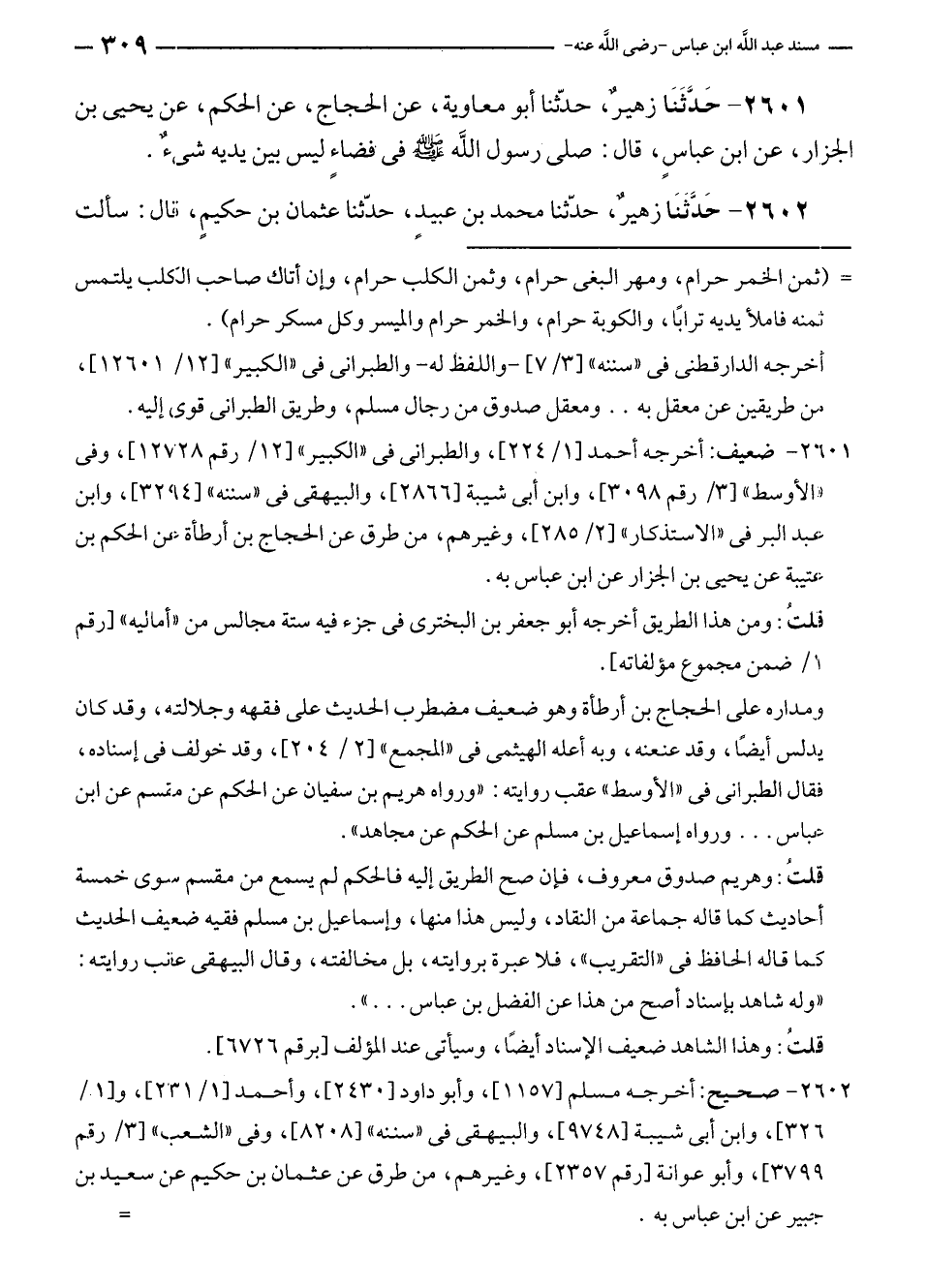 ٢٦٠١ - ضعيف: أخرجه أحمد [١/ ٢٢٤]، والطبرانى في "الكبير" [١٢/ رقم ١٢٧٢٨]، وفى "الأوسط" [٣/ رقم ٣٥٩٨]، وابن أبى شيبة [٢٨٦٦]، والبيهقى في "سننه" [٣٢٩٤]، وابن عبد البر في "الاستذكار" [٢/ ٢٨٥]، وغيرهم، من طرق عن الحجاج بن أرطأة عن الحكم بن عتيبة عن يحيى بن الجزار عن ابن عباس به.