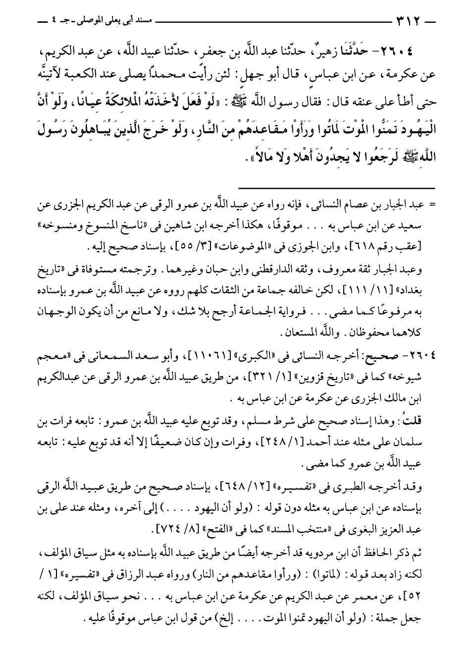 ٢٦٠٤ - حَدَّثَنَا زهيرٌ، حَدَّثَنَا عبد الله بن جعفرٍ، حَدَّثَنَا عبيد الله، عن عبد الكريم، عن عكرمة، عن ابن عباسٍ، قال أبو جهلٍ: لئن رأيت محمدًا يصلى عند الكعبة لآتينَّه حتى أطأ على عنقه قال: فقال رسول الله - صلى الله عليه وسلم -: "لَوْ فَعَلَ لأَخَذَتْهُ الملائِكَةُ عِيَانًا، وَلَوْ أَنَّ الْيَهُودَ تَمَنُّوا الْموْتَ لمَاتُوا وَرَأَوْا مَقَاعِدَهُمْ مِنَ النَّارِ، وَلَوْ خَرَجَ الَّذِينَ يُبَاهِلُونَ رَسُولَ اللَّهِ - صلى الله عليه وسلم - لَرَجَعُوا لا يَجِدُونَ أَهْلا وَلا مَالًا".