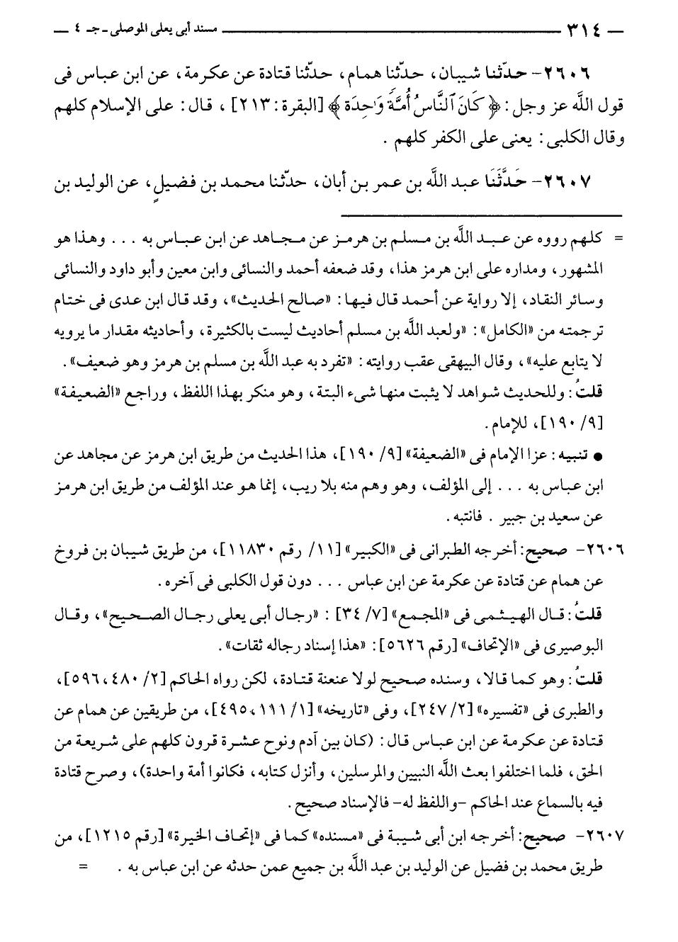 ٢٦٠٦ - حَدَّثَنَا شيبان، حدّثنا همام، حَدَّثَنَا قتادة عن عكرمة، عن ابن عباس في قول الله عز وجل: {كَانَ النَّاسُ أُمَّةً وَاحِدَةً} [البقرة: ٢١٣]، قال: على الإسلام كلهم وقال الكلبى: يعنى على الكفر كلهم.