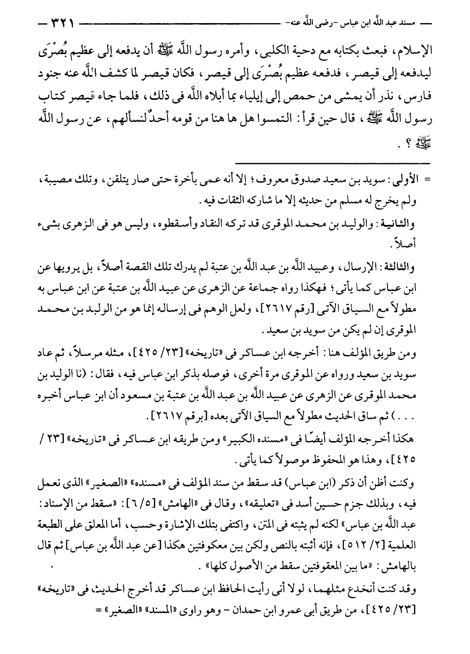 والثالثة: الإرسال، وعبيد الله بن عبد الله بن عتبة لم يدرك تلك القصة أصلًا، بل يرويها عن ابن عباس كما يأتى؛ فهكذا رواه جماعة عن الزهرى عن عبيد الله بن عتبة عن ابن عباس به مطولًا مع السياق الآتى [رقم ٢٦١٧]، ولعل الوهم في إرساله إنما هو من الوليد بن محمد الموقرى إن لم يكن من سويد بن سعيد.