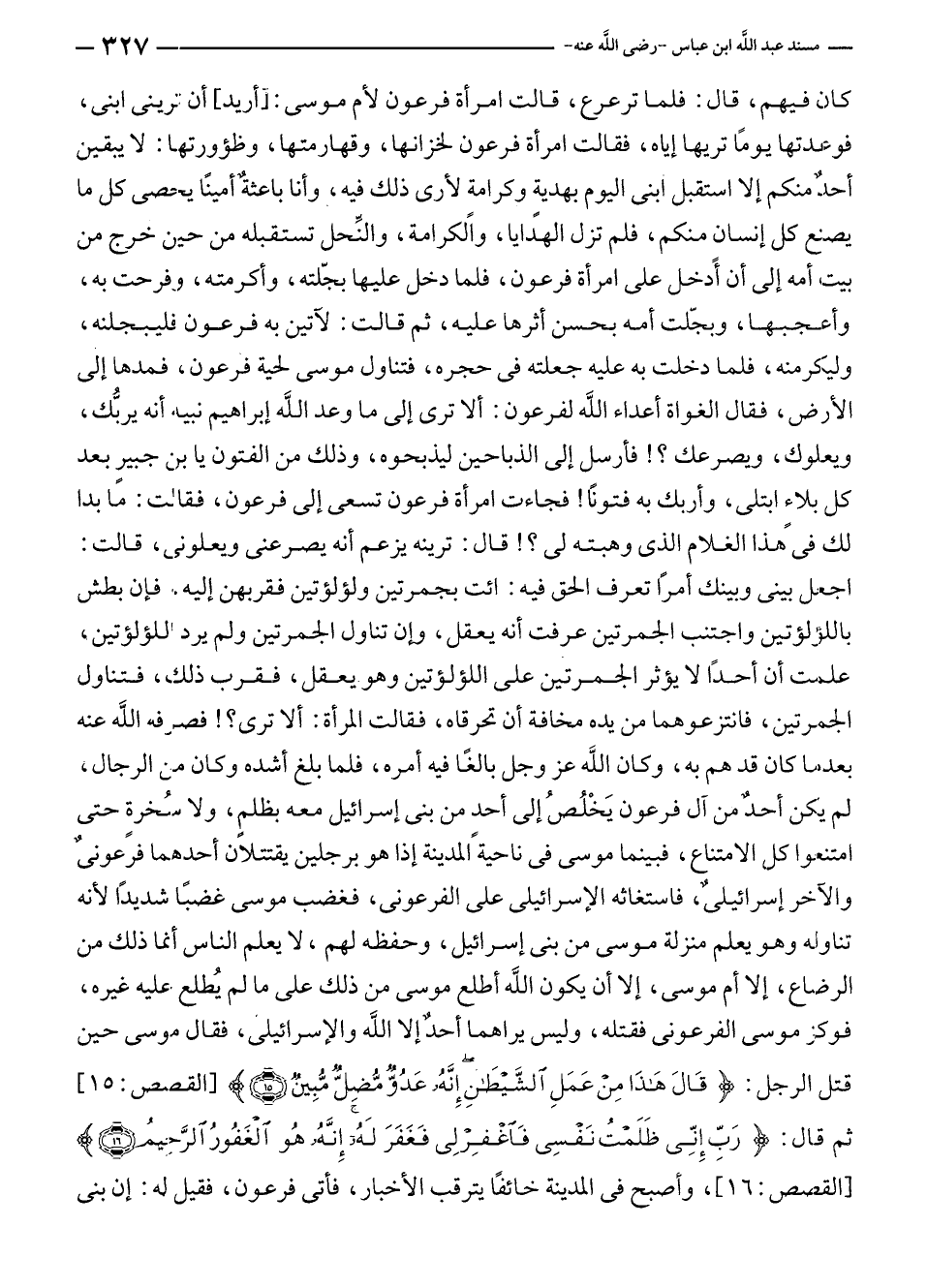 كان فيهم، قال: فلما ترعرع، قالت امرأة فرعون لأم موسى: [أريد] أن ترينى ابنى، فوعدتها يومًا تريها إياه، فقالت امرأة فرعون لخزانها، وقهارمتها، وظؤورتها: لا يبقين أحدٌ منكم إلا استقبل ابنى اليوم بهديةٍ وكرامةٍ لأرى ذلك فيه، وأنا باعثةٌ أمينًا يحصى كل ما يصنع كل إنسان منكم، فلم تزل الهدايا، والكرامة، والنِّحل تستقبله من حين خرج من بيتا أمه إلى أن أدخل على امرأة فرعون، فلما دخل عليها بجّلته، وأكرمته، وفرحت به، وأعجبها، وبجّلت أمه بحسن أثرها عليه، ثم قالت: لآتين به فرعون فليبجلنه، وليكرمنه، فلما دخلت به عليه جعلته في حجره، فتناول موسى لحية فرعون، فمدها إلى الأرض، فقال الغواة أعداء الله لفرعون: ألا ترى إلى ما وعد الله إبراهيم نبيه أنه يربُّك، ويعلوك، ويصرعك؟! فأرسل إلى الذباحين ليذبحوه، وذلك من الفتون يا بن جبيرٍ بعد كل بلاءٍ ابتلى، وأربك به فتونًا! فجاءت امرأة فرعون تسعى إلى فرعون، فقالت: ما بدا لك في هذا الغلام الذي وهبته لى؟! قال: ترينه يزعم أنه يصرعنى ويعلونى، قالت: اجعل بينى وبينك أمرًا تعرف الحق فيه: ائت بجمرتين ولؤلؤتين فقربهن إليه، فإن بطش باللؤلؤتين واجتنب الجمرتين عرفت أنه يعقل، وإن تناول الجمرتين ولم يرد اللؤلؤتين، علمت أن أحدًا لا يؤثر الجمرتين على اللؤلؤتين وهو يعقل، فقرب ذلك، فتناول الجمرتين، فانتزعوهما من يده مخافة أن تحرقاه، فقالت المرأة: ألا ترى؟! فصرفه الله عنه بعدما كان قد هم به، وكان الله عز وجل بالغًا فيه أمره، فلما بلغ أشده وكان من الرجال، لم ركن أحدٌ من آل فرعون يَخْلُصُ إلى أحد من بنى إسرائيل معه بظلمٍ، ولا سُخرة حتى امتنعوا كل الامتناع، فبينما موسى في ناحية المدينة إذا هو برجلين يقتتلان أحدهما فرعونىٌ والآخر إسرائيلى، فاستغاثه الإسرائيلى على الفرعونى، فغضب موسى غضبًا شديدًا لأنه تناوله وهو يعلم منزلة موسى من بنى إسرائيل، وحفظه لهم، لا يعلم الناس أنما ذلك من الرضاع، إلا أم موسى، إلا أن يكون الله أطلع موسى من ذلك على ما لم يُطلع عليه غيره، فوكز موسى الفرعونى فقتله، وليس يراهما أحدٌ إلا الله والإسرائيلى، فقال موسى حين قتل الرجل: {قَالَ هَذَا مِنْ عَمَلِ الشَّيْطَانِ إِنَّهُ عَدُوٌّ مُضِلٌّ مُبِينٌ (١٥)} [القصص: ١٥] ثم قال: {رَبِّ إِنِّي ظَلَمْتُ نَفْسِي فَاغْفِرْ لِي فَغَفَرَ لَهُ إِنَّهُ هُوَ الْغَفُورُ الرَّحِيمُ (١٦)} [القصص: ١٦]، وأصبح في المدينة خائفًا يترقب الأخبار، فأتى فرعون، فقيل له: إن بنى