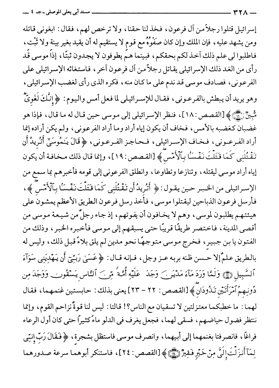 إسرائيل قتلوا رجلًا من آل فرعون، فخذ لنا حقنا، ولا ترخص لهم، فقال: ابغونى قاتله ومن يشهد عليه، فإن الملك وإن كان صَفْوُهُ مع قومٍ لا يستقيم له أن يقيد بغير بينة ولا ثَبْتٍ، فاطلبوا لى علم ذلك آخذ لكم بحقكم، فبينما هم يطوفون لا يجدون ثبتًا، إذًا موسى قد رأى من الغد ذلك الإسرائيلى يقاتل رجلًا من آل فرعون آخر، فاستغاثه الإسرائيلى على الفرعونى، فصادف موسى قد ندم على ما كان منه، فكره الذي رأى لغضب الإسرائيلى، وهو يريد أن يبطش بالفرعونى، فقال للإسرائيلى لما فعل أمس واليوم: {إِنَّكَ لَغَوِيٌّ مُبِينٌ (١٨)} [القصص: ١٨]، فنظر الإسرائيلى إلى موسى حين قال له ما قال، فإذا هو غضبان كغضبه بالأمس، فخاف أن يكون إياه أراد وما أراد الفرعونى، ولم يكن أراده إنما أراد الفرعونى، فخاف الإسرائيلى، فحاجز الفرعونى، {قَالَ يَامُوسَى أَتُرِيدُ أَنْ تَقْتُلَنِي كَمَا قَتَلْتَ نَفْسًا بِالْأَمْسِ} [القصص: ١٩]، وإنما قال ذلك مخافة أن يكون إياه أراد موسى ليقتله، وتنازعا وتطاوعا، وانطلق الفرعونى إلى قومه فأخبرهم بما سمع من الإسرائيلى من الخبر حين يقول: {أَتُرِيدُ أَنْ تَقْتُلَنِي كَمَا قَتَلْتَ نَفْسًا بِالْأَمْسِ}، فأرسل فرعون الذباحين ليقتلوا موسى، فأَخذ رسل فرعون الطريق الأعظم يمشون على هيئتهم يطلبون لموسى، وهم لا يخافون أن يفوتهم، إذ جاء رجلٌ من شيعة موسى من أقصى المدينة، فاختصر طريقًا قريبًا حتى يسبقهم إلى موسى فأخبره الخبر، وذلك من الفتون يا بن جبيرٍ، فخرج موسى متوجهًا نحو مدين لم يلق بلاءً قبل ذلك، وليس له بالطريق علمٌ إلا حسن ظنه بربه عز وجل، فإنه قال: {عَسَى رَبِّي أَنْ يَهْدِيَنِي سَوَاءَ السَّبِيلِ (٢٢) وَلَمَّا وَرَدَ مَاءَ مَدْيَنَ وَجَدَ عَلَيْهِ أُمَّةً مِنَ النَّاسِ يَسْقُونَ وَوَجَدَ مِنْ دُونِهِمُ امْرَأَتَيْنِ تَذُودَانِ} [القصص: ٢٢، ٢٣] يعنى بذلك: حابستين غنمهما، فقال لهما: ما خطبكما معتزلتين لا تسقيان مع الناس؟! قالتا: ليس لنا قوةٌ نزاحم القوم، وإنما ننتظر فضول حياضهم، فسقى لهما، فجعل يغرف في الدلو ماءً كثيرًا حتى كان أول الرعاء فراغًا، فانصرفتا بغنمهما إلى أبيهما، وانصرف موسى فاستظل بشجرةٍ، {فَقَالَ رَبِّ إِنِّي لِمَا أَنْزَلْتَ إِلَيَّ مِنْ خَيْرٍ فَقِيرٌ (٢٤)} [القصص: ٢٤]، فاستنكر أبوهما سرعة صدورهما
