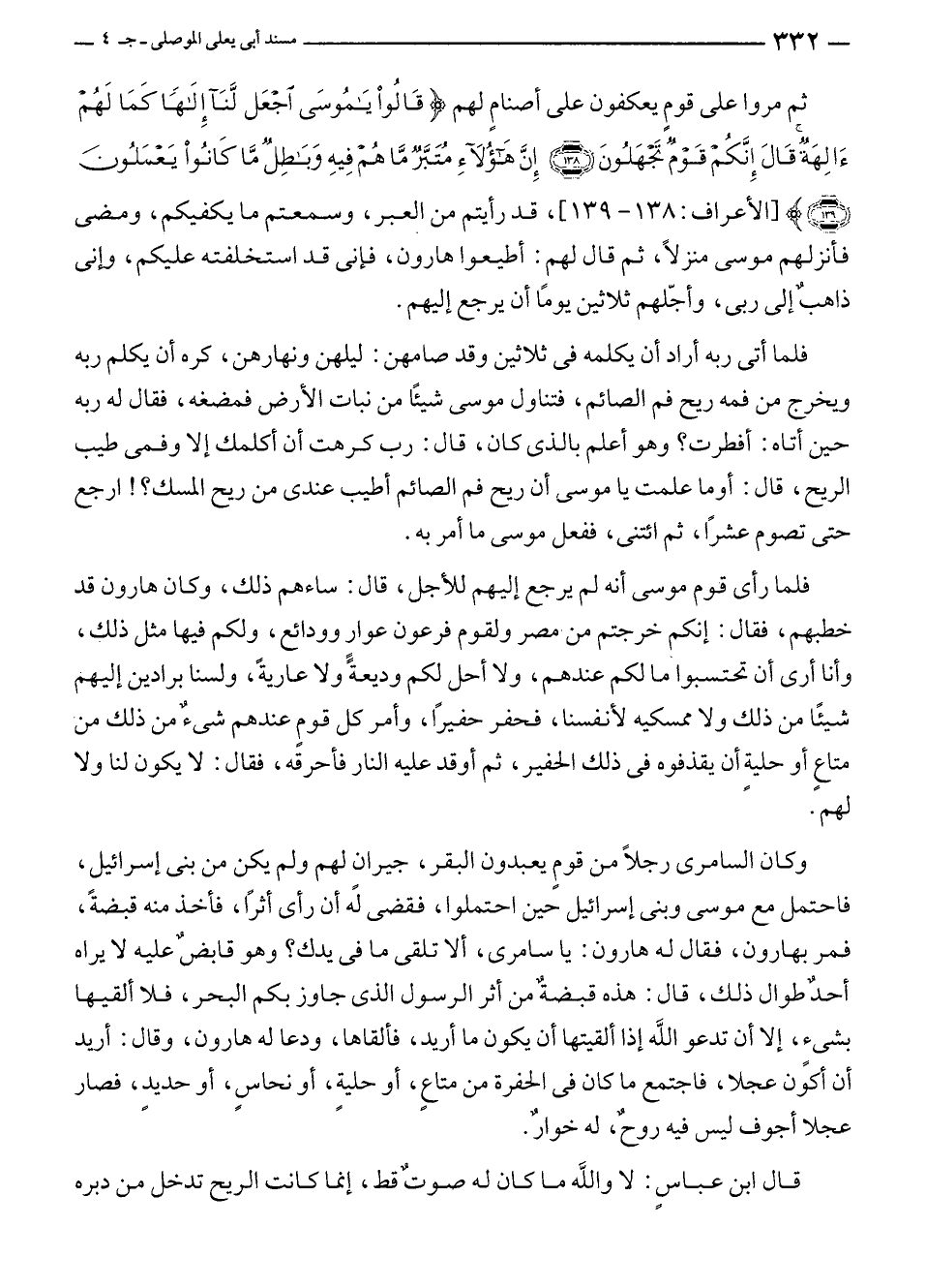 فلما رأى قوم موسى أنه لم يرجع إليهم للأجل، قال: ساءهم ذلك، وكان هارون قد خطبهم، فقال: إنكم خرجتم من مصر ولقوم فرعون عوارٍ وودائع، ولكم فيها مثل ذلك، وأنا أرى أن تحتسبوا ما لكم عندهم، ولا أحل لكم وديعة ولا عاريةً، ولسنا برادين إليهم شيئًا من ذلك ولا ممسكيه لأنفسنا، فحفر حفيرًا، وأمر كل قومٍ عندهم شئٌ من ذلك من متاعٍ أو حليةٍ أن يقذفوه في ذلك الحفير، ثم أوقد عليه النار فأحرقه، فقال: لا يكون لنا ولا لهم.