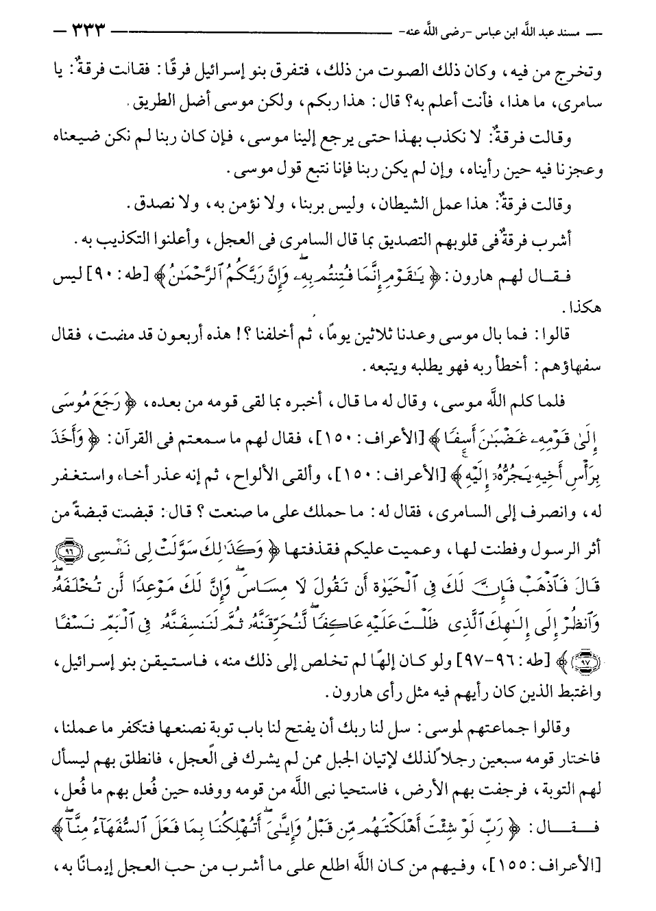 فلما كلم الله موسى، وقال له ما قال، أخبره بما لقى قومه من بعده، {رَجَعَ مُوسَى إِلَى قَوْمِهِ غَضْبَانَ أَسِفًا} [الأعراف: ١٥٠]، فقال لهم ما سمعتم في القرآن: {وَأَخَذَ بِرَأْسِ أَخِيهِ يَجُرُّهُ إِلَيْهِ} [الأعراف: ١٥٠]، وألقى الألواح، ثم إنه عذر أخاه، واستغفر له، وانصرف إلى السامرى، فقال له: ما حملك على ما صنعت؟ قال: قبضت قبضةً من أثر الرسول وفطنت لها، وعميت عليكم فقذفتها {وَكَذَلِكَ سَوَّلَتْ لِي نَفْسِي (٩٦) قَالَ فَاذْهَبْ فَإِنَّ لَكَ فِي الْحَيَاةِ أَنْ تَقُولَ لَا مِسَاسَ وَإِنَّ لَكَ مَوْعِدًا لَنْ تُخْلَفَهُ وَانْظُرْ إِلَى إِلَهِكَ الَّذِي ظَلْتَ عَلَيْهِ عَاكِفًا لَنُحَرِّقَنَّهُ ثُمَّ لَنَنْسِفَنَّهُ فِي الْيَمِّ نَسْفًا (٩٧)} [طه: ٩٦، ٩٧] ولو كان إلهًا لم تخلص إلى ذلك منه، فاستيقن بنو إسرائيل، واغتبط الذين كان رأيهم فيه مثل رأى هارون.