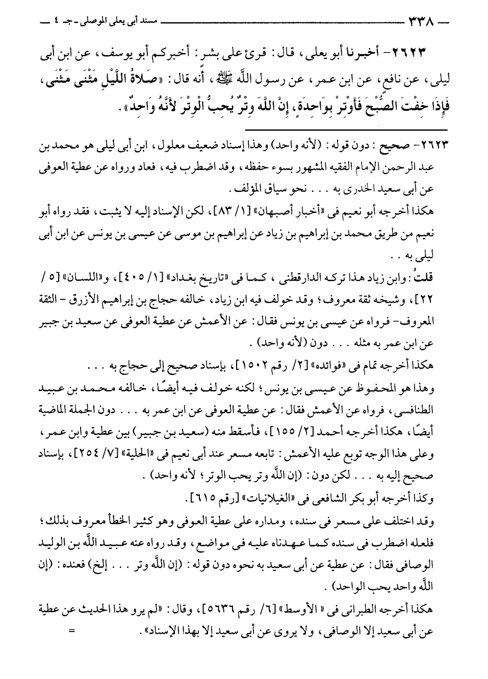 ٢٦٢٣ - أخبرنا أبو يعلى، قال: قرئ على بشرٍ: أخبركم أبو يوسف، عن ابن أبى ليلى، عن نافعٍ، عن ابن عمر، عن رسول الله - صلى الله عليه وسلم -، أنه قال: "صَلاةُ اللَّيْلِ مَثْنَى مَثْنَى، فَإِذَا خِفْتَ الصُّبْحَ فَأَوْتِرْ بِوَاحِدَةٍ، إِنَّ اللَّهَ وِتْرٌ يُحِبُّ الْوِتْرَ لأَنَّهُ وَاحِدٌ".