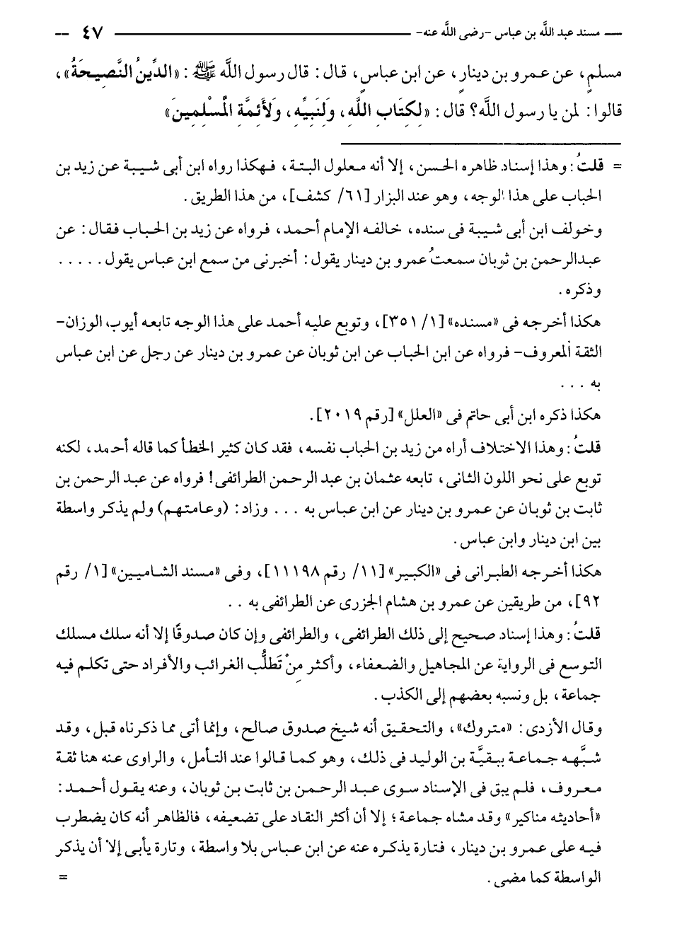 قلتُ: وهذا الاختلاف أراه من زيد بن الحباب نفسه، فقد كان كثير الخطأ كما قاله أحمد، لكنه توبع على نحو اللون الثاني، تابعه عثمان بن عبد الرحمن الطرائفى! فرواه عن عبد الرحمن بن ثابت بن ثوبان عن عمرو بن دينار عن ابن عباس به ... وزاد: (وعامتهم) ولم يذكر واسطة بين ابن دينار وابن عباس.