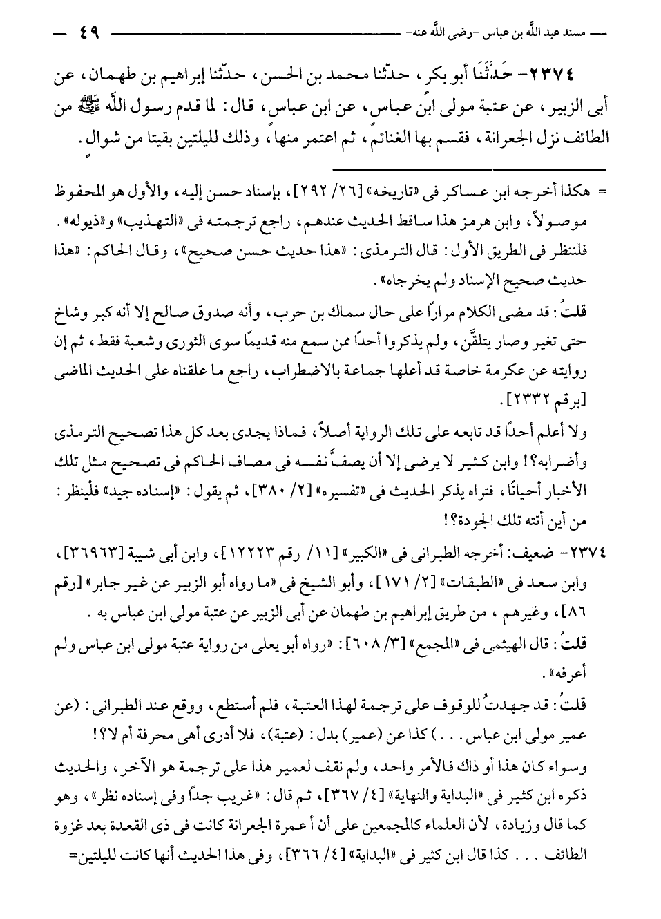 ٢٣٧٤ - حَدَّثَنَا أبو بكرٍ، حَدَّثَنَا محمد بن الحسن، حَدَّثَنَا إبراهيم بن طهمان، عن أبى الزبير، عن عتبة مولى ابن عباسٍ، عن ابن عباس، قال: لما قدم رسول الله - صلى الله عليه وسلم - من الطائف نزل الجعرانة، فقسم بها الغنائم، ثم اعتمر منها، وذلك لليلتين بقيتا من شوالٍ.