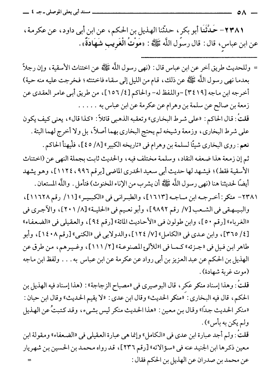٢٣٨١ - حَدَّثَنَا أبو بكرٍ، حَدَّثَنَا الهذيل بن الحكم، عن ابن أبى داود، عن عكرمة، عن ابن عباسٍ، قال: قال رسول الله - صلى الله عليه وسلم -: "مَوْتُ الْغَرِيبِ شَهَادَةٌ".